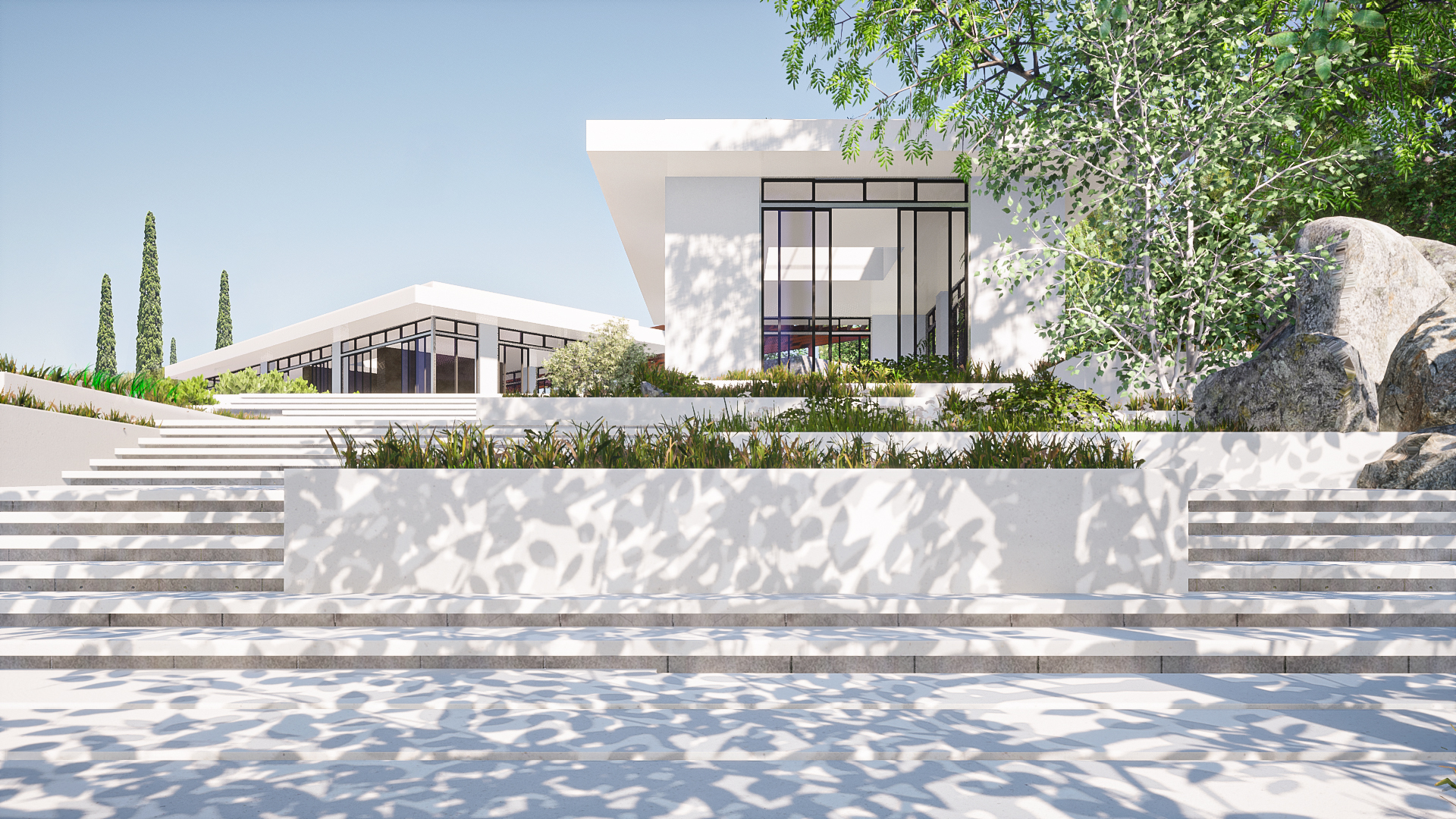 Soil conservation: minimised building footprint so that less ground area is utilised by construction. The whole structure sits on a natural stone "podium", which strengthens the soil and protects it from landslides.