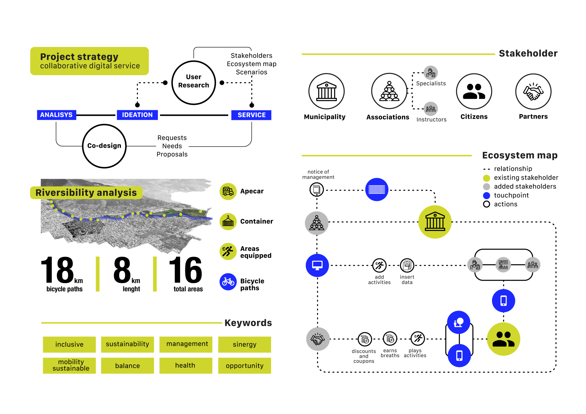 Nature is an essential component of human life. In fact, it acts on the immunitary system, increasing energy levels, decreasing anxiety, depression and stress and thus restoring well-being to the human being. Wellness, as such, is no longer to be understood exclusively as the absence of disease, but rather as an overall system in which “feeling good” is guaranteed by a balance between physical and psychological health. Riverdo acts in this sense, recreating a condition of harmony for the entire ecosystem and, therefore, improving the quality of life in the city. Specifically, the service offers the citizen a twofold gain: on the one hand, he/she carries out activities for both body and mind in the river park, and on the other, he/she also approaches sustainability through a gamification system. This system, however, also produces a gain for the other stakeholders involved in the project, but first and foremost it produces a gain for the city which, through the system designed, manages to make itself healthy: to give breath and beauty.
