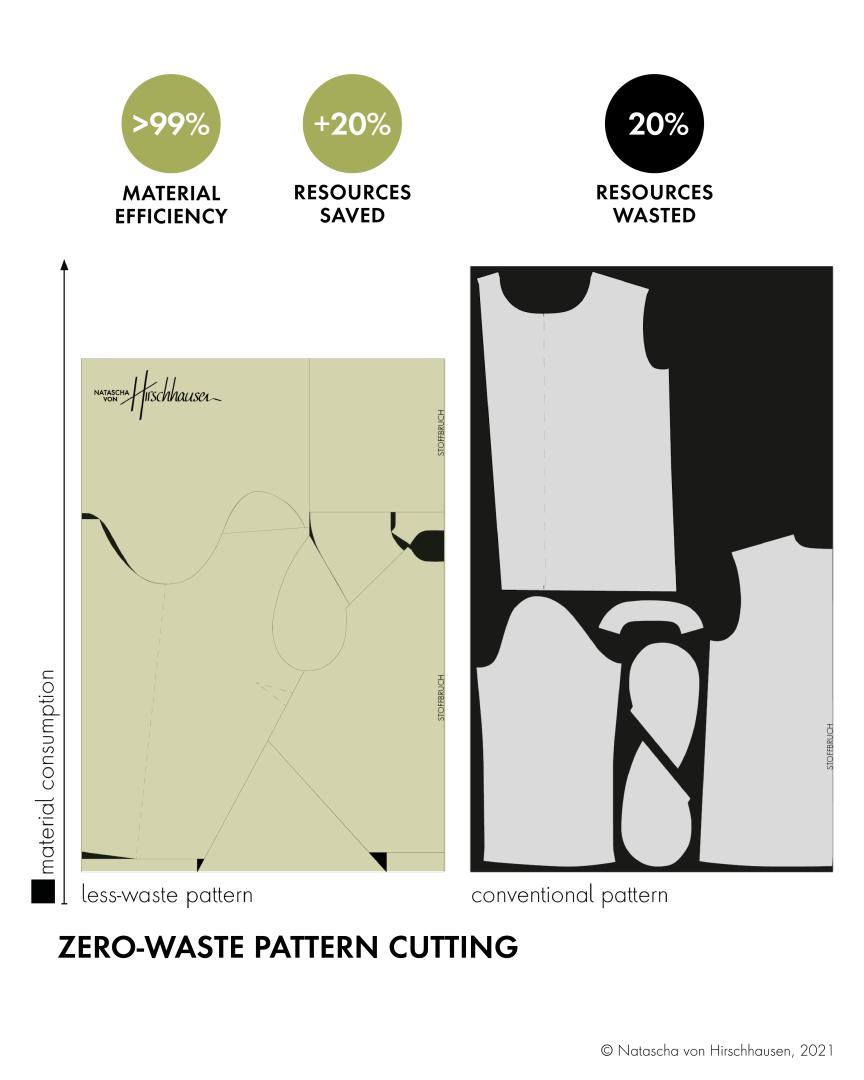 Using our pantsuit as an example, we illustrate the clear advantages of our innovation: We need 3.80 m2 of cotton for a pantsuit. A conventional suit, on the other hand, uses about 5.18 m2 of material. In comparison, we thus save about 26% of the material for our suit, which means that 1.29 m2 of material are saved for each cut of the zero-waste suit. The waste from conventional cutting corresponds to about 0.31 kg of cotton material per cut. Therefore, at least 0.31 kg less cotton must be grown for our pantsuit. Zero-waste cutting thus saves 2.3 m2 of cultivation area per suit. In addition, 3410 litres less water are used per suit.