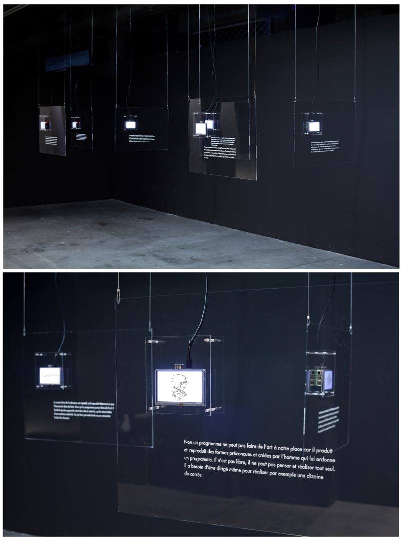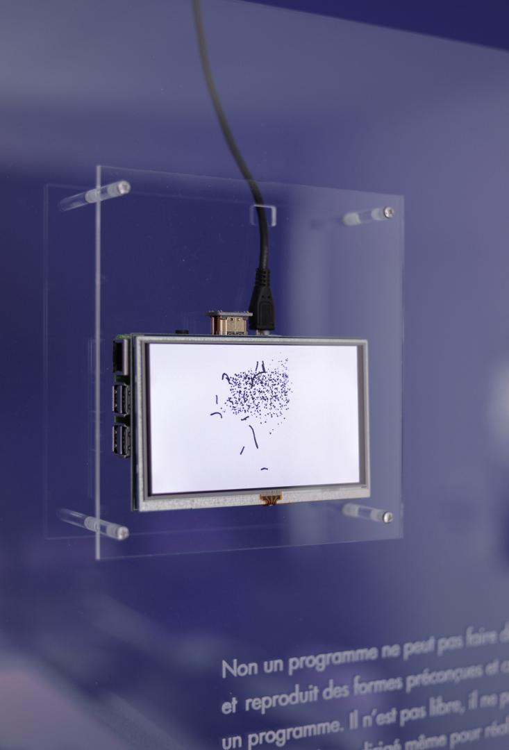 As an art installation, Logical Drawings involves the design of that space, together with a drawing algorithm based on machine learning. Used as primary material, responses the high school students gave to the survey in Generic Images offer a discursive counterpoint to the presentation of the generated images. Answers to questions such as – “do you think an algorithm can do art for you?”, raised awareness of the place of the human and his relation to the machine through a process of artistic creation. Referring to freewill, intention, nature or technology, answers showed great diversity. In the installation, they are displayed together with generative drawings produced with the help of low consumption nano-computers.