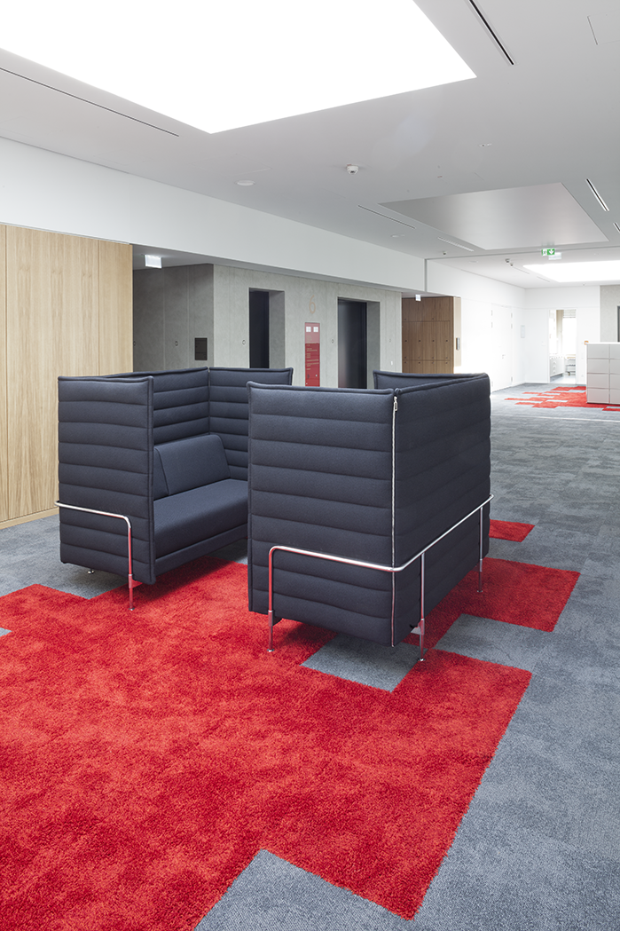 The light-flooded glass upper levels were constructed with the aim of extending the historic building, by taking away the heaviness of the building through transparency and light. Futhermore, in the new rooms, the grey of the concrete is taken up and complemented in a pleasant way with light wood elements and red accents. MARCHIVUM, with its inviting appearance opens itself symbolically to the city and its society.