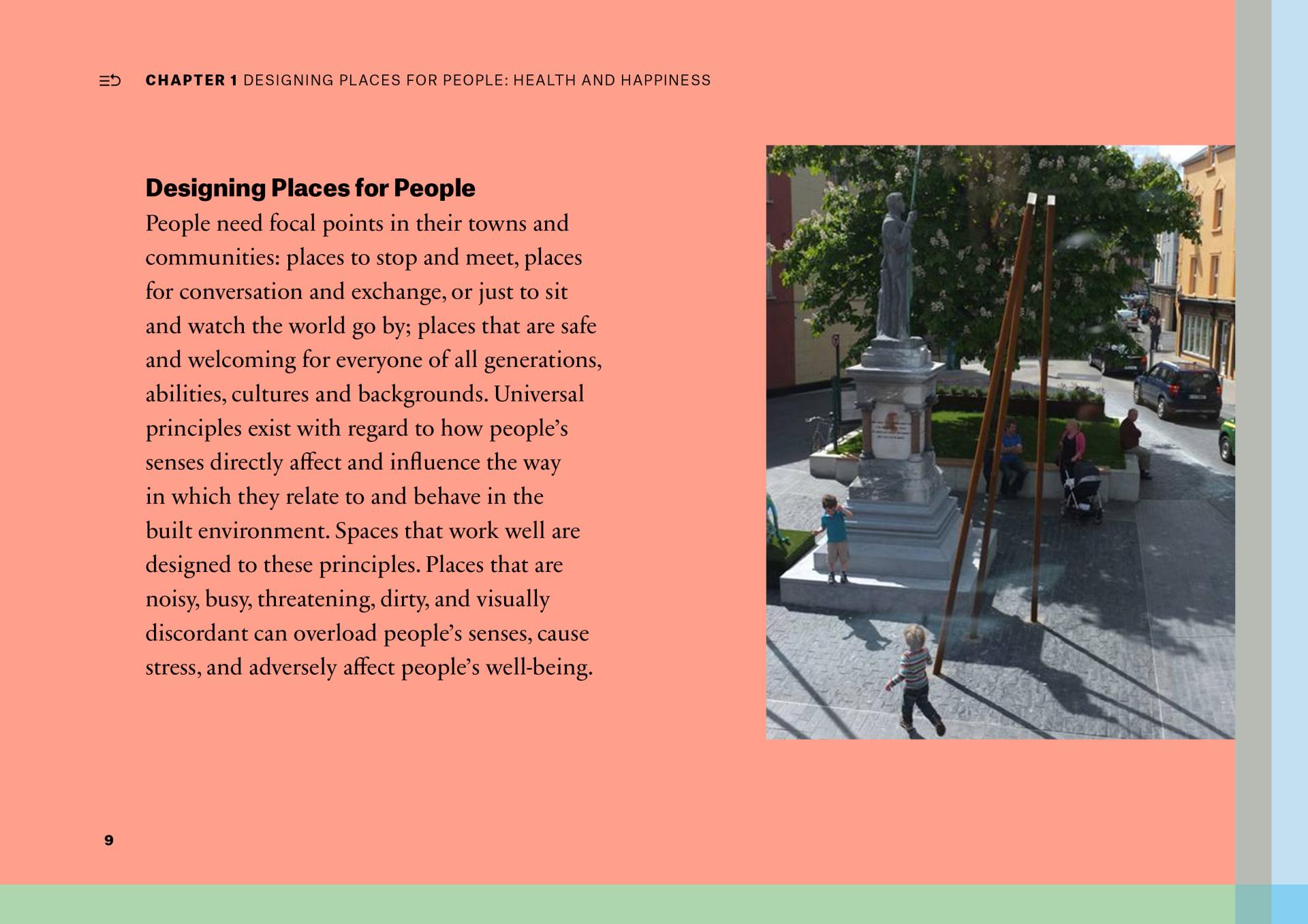 ‘Creating Places for People: The RIAI Town and Village Toolkit’ identifies that everyone needs to be considered and involved in how we plan and design our towns and villages. This is implicit throughout the document – Chapter 6 emphasises that people should be fully represented and involved in the creative process, so that they have a sense of ownership. The case studies are representative of how an inclusive process can have successful outcomes with long-term benefits.