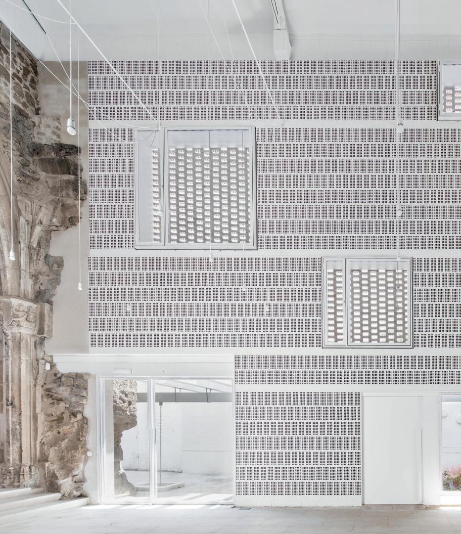 The structure mantained the original stone walls, with open white brick walls on the new areas. The idea of collage-like walls and complementing materials reflecting the mixture of uses of the Building since its creation as well as the new and modern ones.