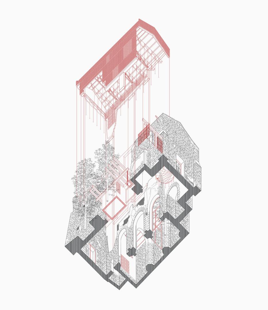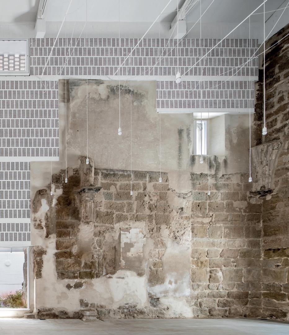 The design always kept in mind the plant of the ancient church and the best way to preserve old remains. The damaged stone walls were incorporated as a representative and foundational base of the new building, giving a new life to these remains which had been abandoned and unused for a long period.