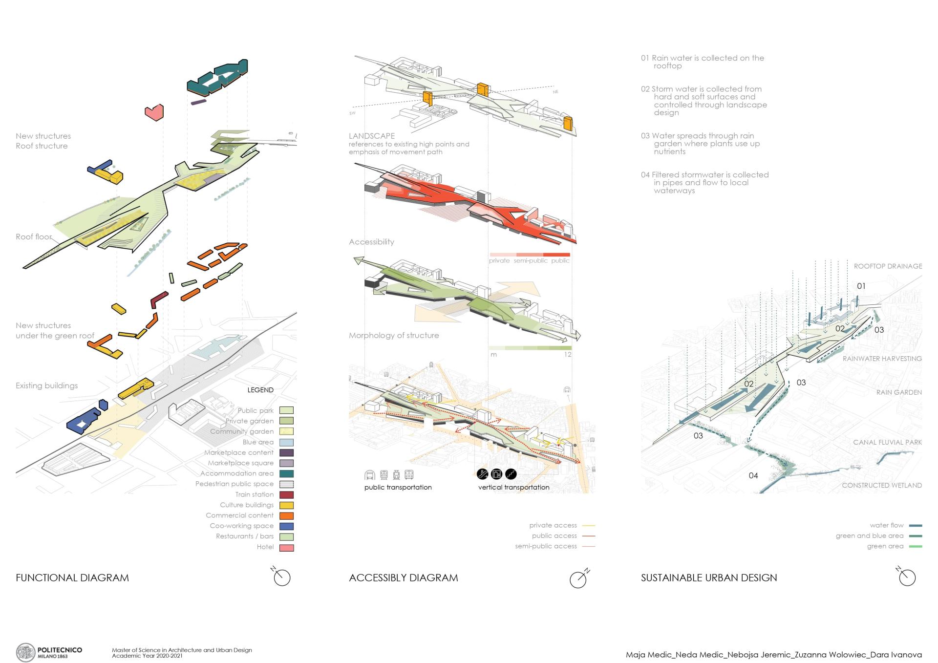 Redefinition of the brownfield areas by the means of green and blue urban design establishes a new identity not only of the particular neighborhood, but of the city as a whole, portraying it as an eye pleasant and more vibrant. In the case of Porta Romana brownfield, the urban hybrid structure proposed by the project provides two general aesthetic principles: