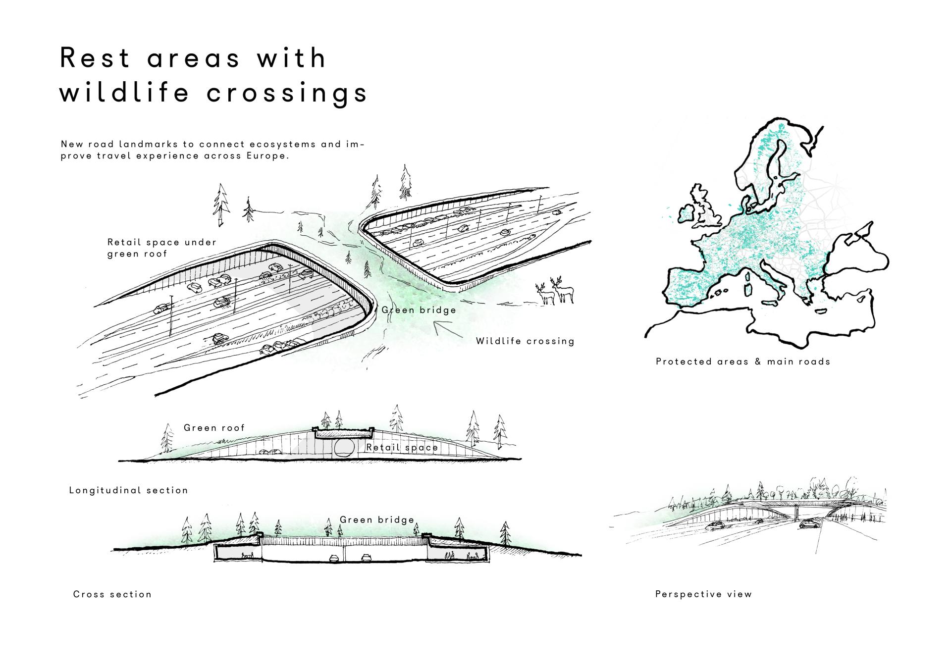 A rest area with wildlife crossings would be a place to charge electric-powered vehicles, while visitors would be immersed in nature, getting inspired to care for the environment. Buildings would have green roofs to seamlessly link the surrounding natural landscapes. This concept aims at reversing ecosystem fragmentation, amidst the growing extent of transport infrastructure.
