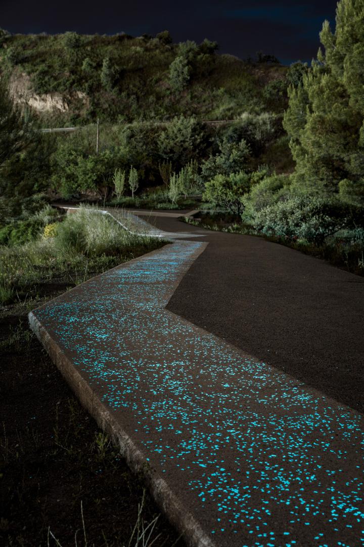 Finally, a fraction of luminescent aggregate was included in the concrete composition of the accessible strip to give this subtle effect during the early hours of the night, achieving a surprise effect but at the same time an improvement in road performance, since it enables more hours of use.