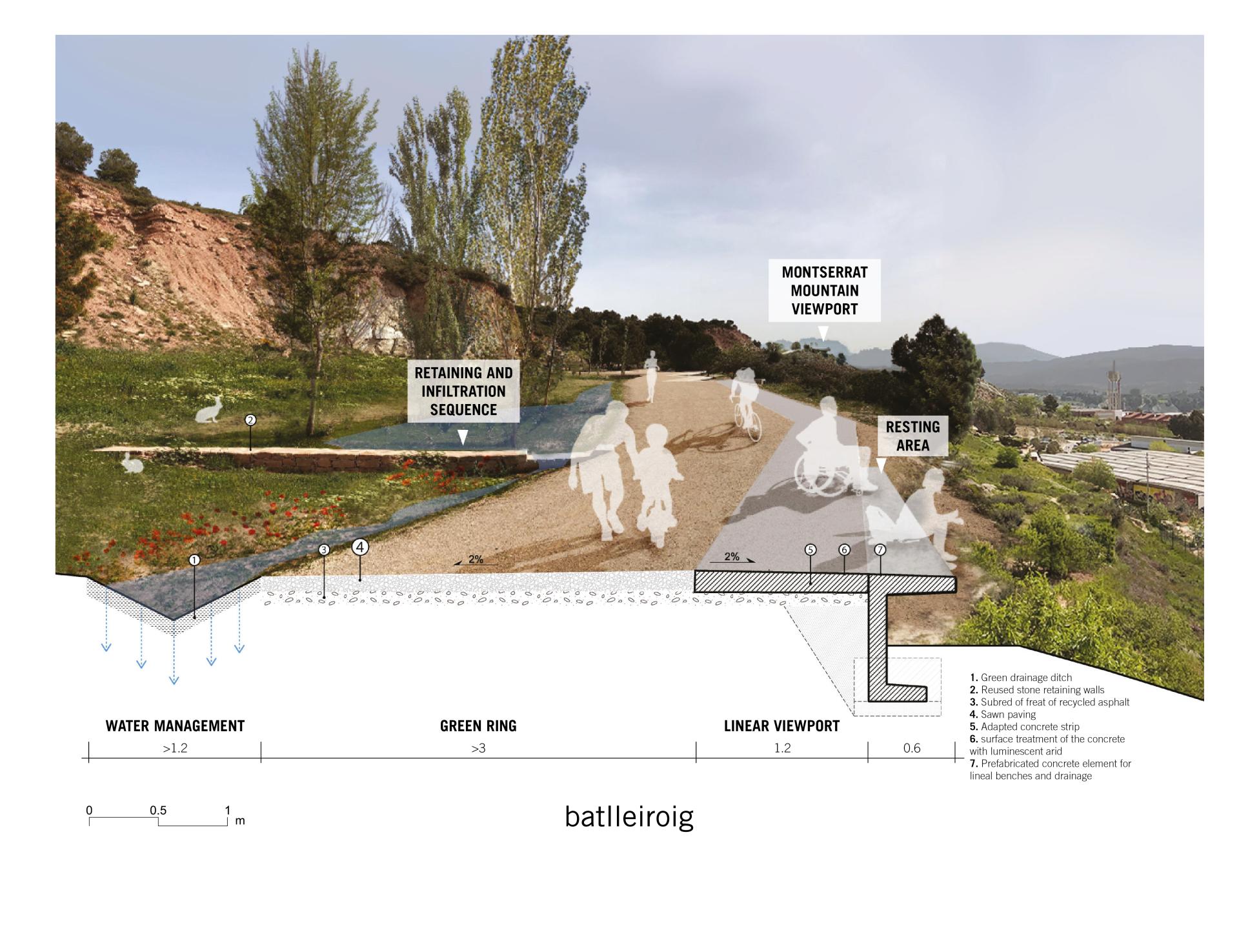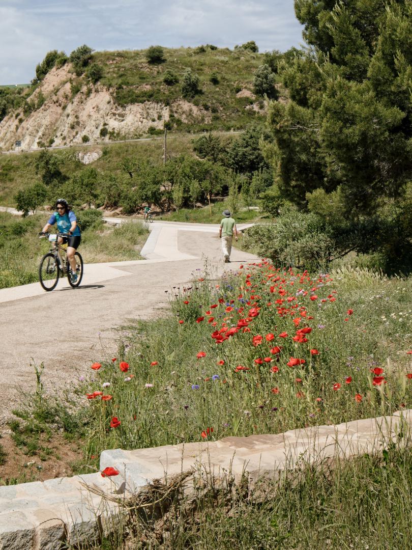 The project continues the Igualada Green Ring through the area by means of a path with a minimum width of 3 m. This width is enough to have a correct accessibility and coexistence between the different active mobility users.