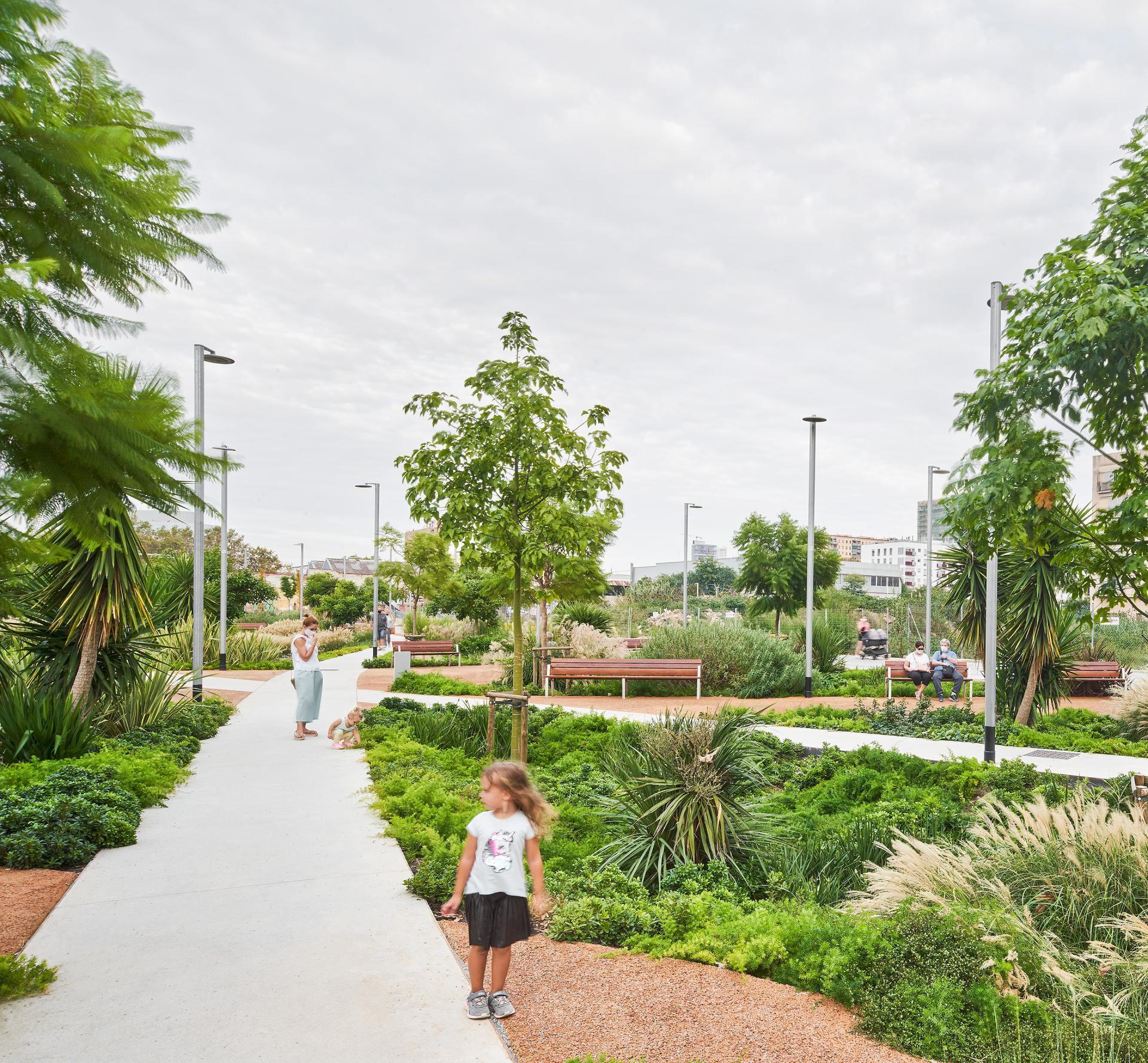 It is found in Barcelona's 22@ technology district, in Poblenou, and forms part of the strategy of structuring the city through green corridors, creating healthy and functional spaces to stimulate neighborhood activity. Citizens have been placed at the center, encouraging their participation to generate a new multifunctional urban ecosystem designed by and for people, contributing directly to the Sustainable Development Goals, including SDG 11 on inclusive, safe, resilient and sustainable cities.