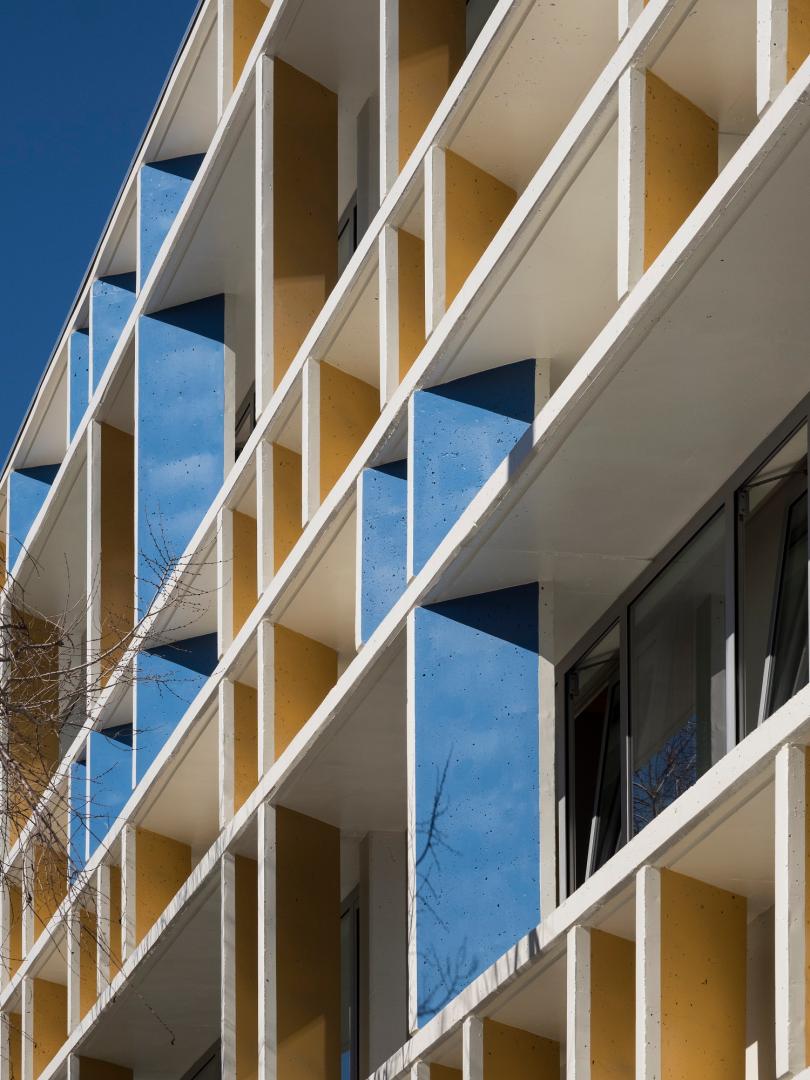 Façades were designed to provide light and shade to minimize direct sunlight into the classrooms and working spaces. A detailed acoustic and study of colour was carried out at project stage to optimize the interior spaces (especially of classrooms), since there is a close connection between the quality of the indoor environment and the learning process (for concentration and clarity of visual and oral contents), and especially more so for students with visual or hearing limitations.