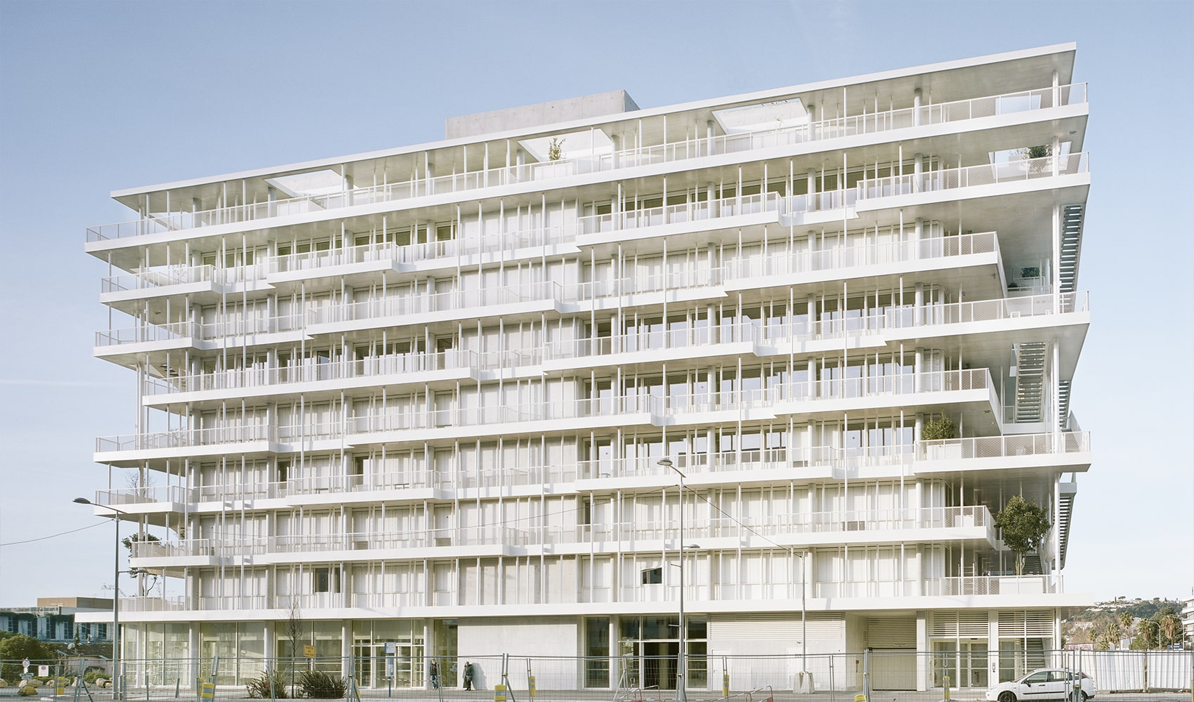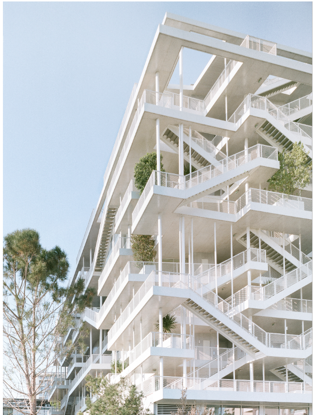 The point of view of Mediterranean architecture led the architects to offer outdoor spaces and a white unconventional facade. There was a desire to invite the Mediterranean vegetation within the architecture, thanks to tall trees at each level, animating the facade and echoing the regional landscape.