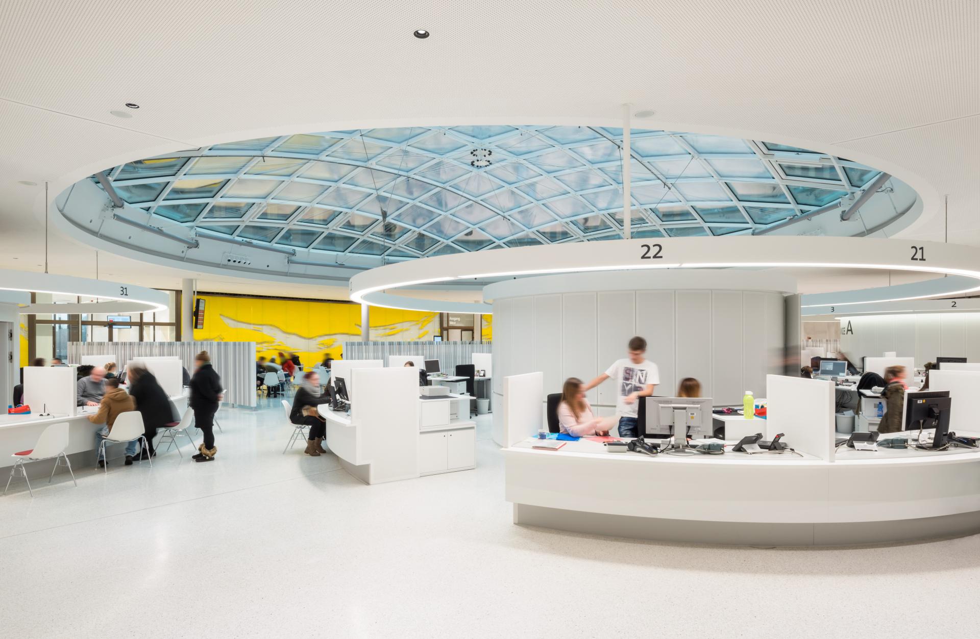 The offices’ room climate concept features thermal mass activation, heating/cooling sails, external solar screening, triple glazing and mechanical background ventilation with heat recovery, which are all part of the energy-saving concept. In addition, users have the benefit of openable ventilation panels which they can use to manually control the room climate by letting fresh air in. In the citizen service center’s public areas, in the restaurant and conference area, the more complex air-conditioning requirements are met by heating and cooling ceiling systems and a partial air-conditioning system with highly efficient heat recovery.