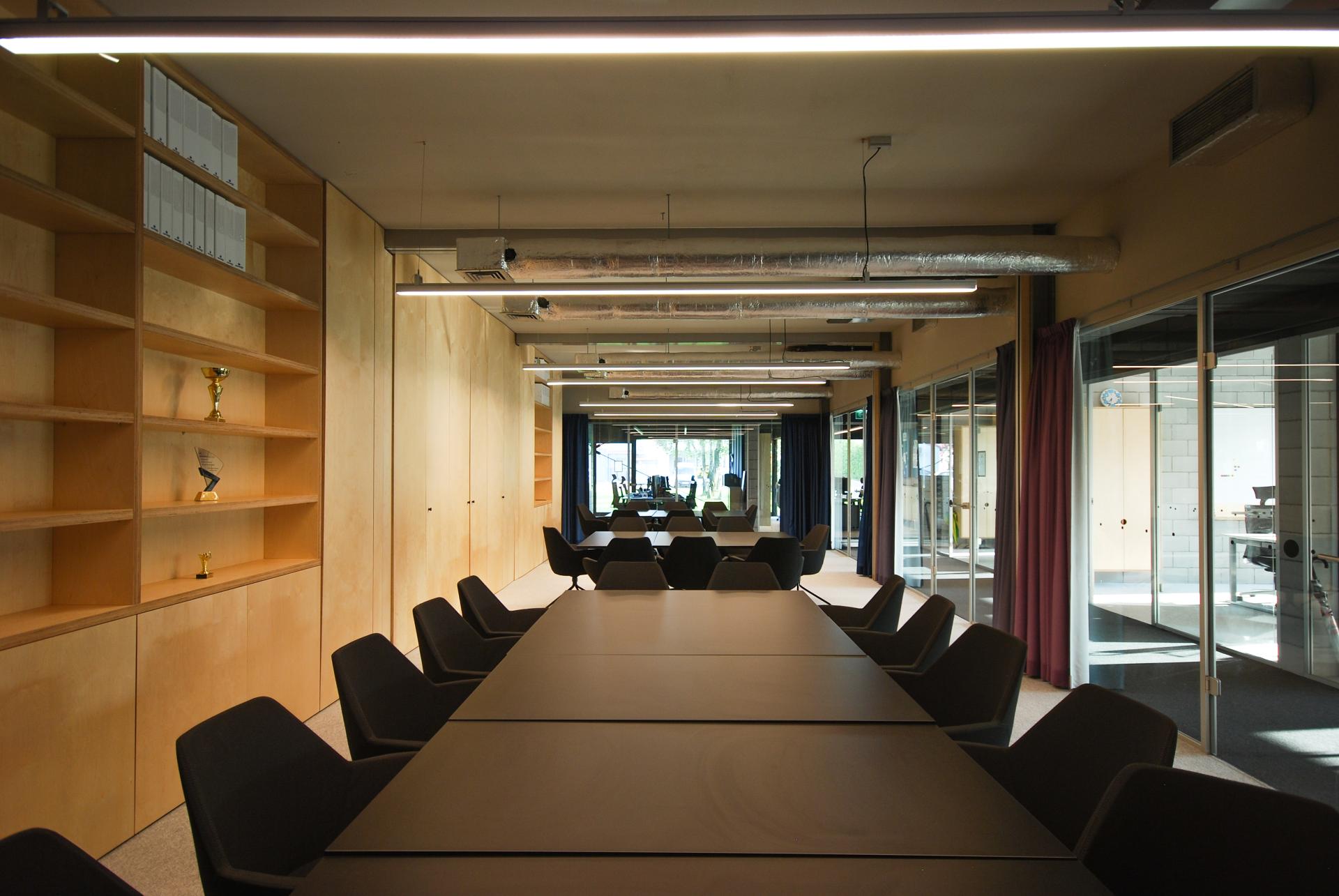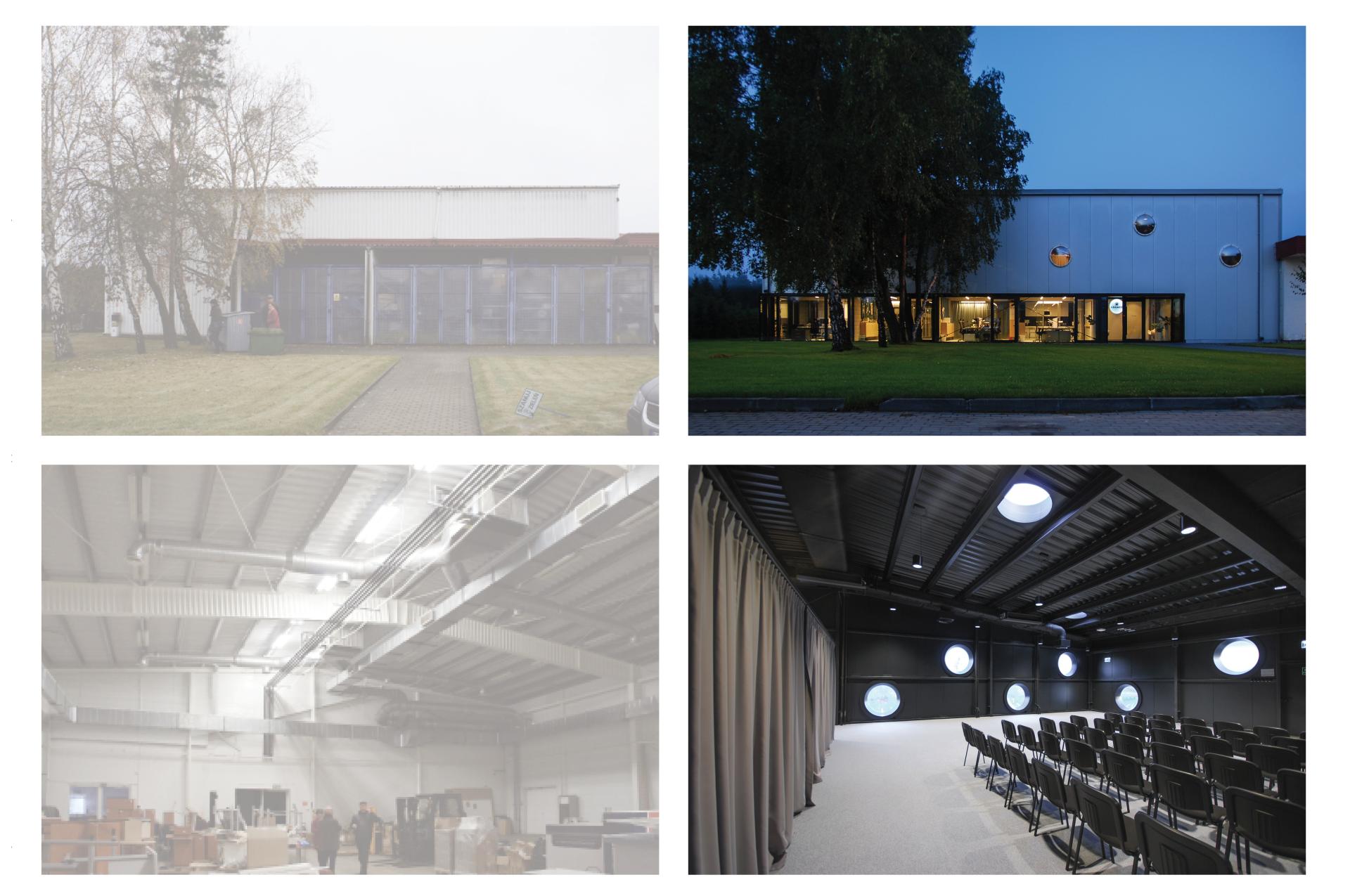 Low budget led to pragmatic and affordable material solutions. We decided to replace 90’ elevation panels with the metallic multi-layer panels. The roof remained untouched due to its existing structure being very economical and expensive to replace. It was painted with the anticorrosive paint in colour matching the facade. The new glass facade on the ground floor protrudes the panels. Round polycarbonate skylights were chosen as a low-cost solution for providing sunlight to the mezzanine. Their placement reflected the building structure. Slab and walls were painted dark. One wall was left without a finishing, exposing the concrete blocks. The conference rooms were divided with movable walls and receive additional lighting through the glazed corridors.