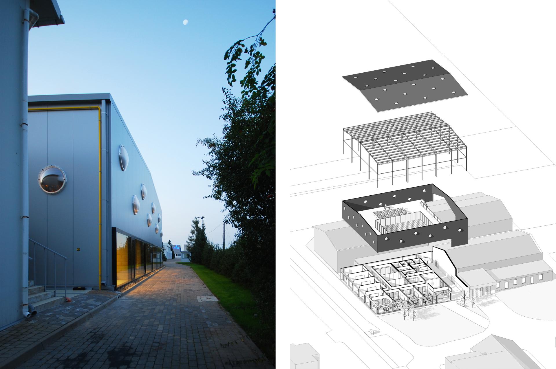This building demonstrated how with a low budget, a whole new life can be brought to an inconspicuous storage building. Today it is an everyday workplace for the company’s management and the fitness studio serves all the employees well. We are delighted that it was possible to create a distinctive building within the monotonous suburban industrial build environment. Distinctive form perfectly manifests it’s social nature whilst hinting the company’s pharmaceutical profile.