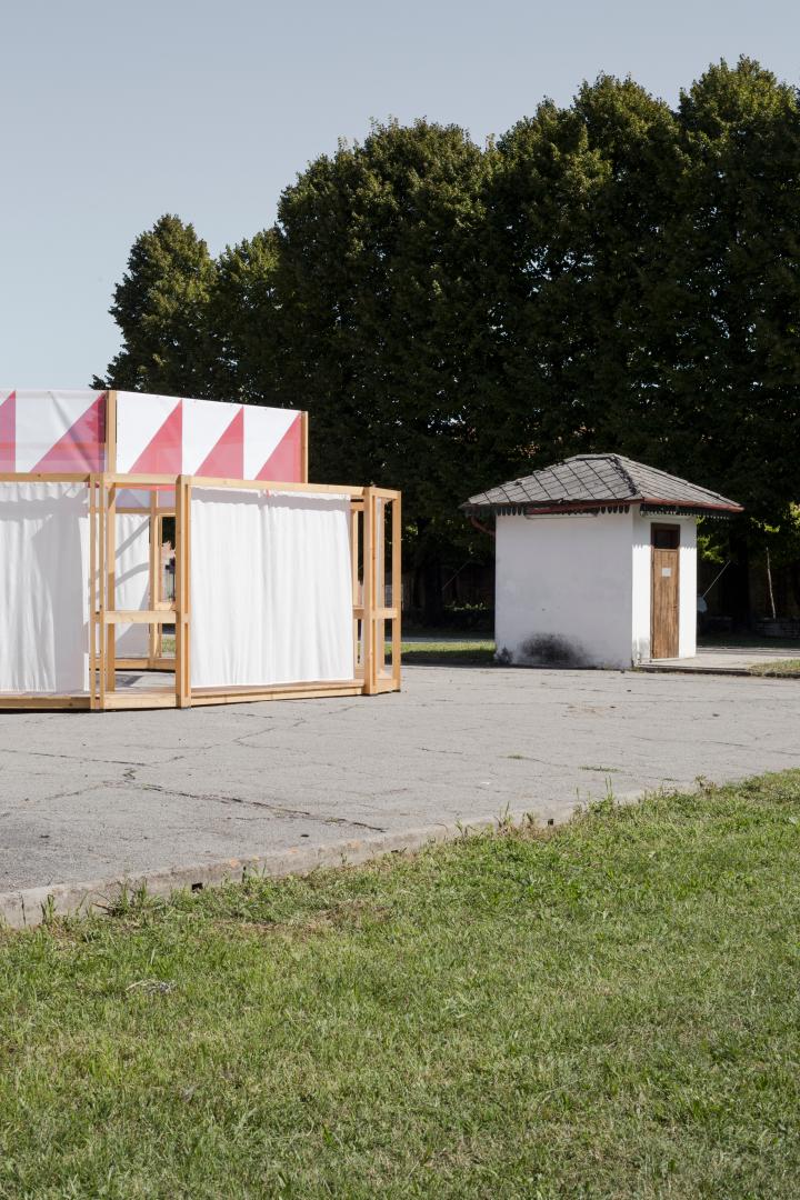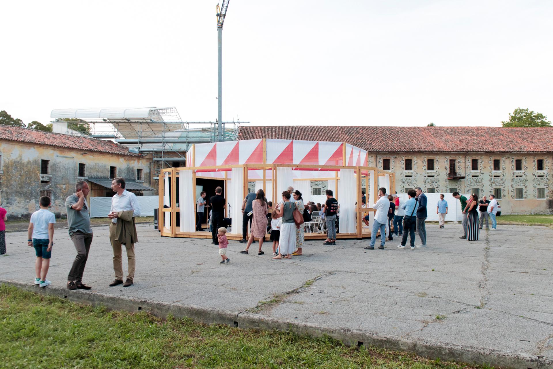 The conceptual core of the design was the central plan because of its ability to indicate a pivotal point - coherently with our suggestion that, at a bigger scale, it is how the barchessa could work for the village. The centrality was also able to materially foster the gathering of people in a defined and yet, in this case, not closed space. The "framework" aesthetic was expressly temporary: the fixed structure of the pavilion was a permeable framework to indicate a place, fluidly defined by flowing curtains. Accordingly to this designed centrality, the pavilion was placed at the center of the "aia" on the platform where the wheat was once used to be dried. This supports a specific phenomenology of the place, as once one entered the courtyard, one was invited to reach its center, a standpoint to perceive the built landscape in its entirety (this was also due to the fact that the buildings themselves are not accessible to the public, as they are in precarious conditions). The decoration - the patterned textile running around the top of the pavilion - works as one with the structure and declares once more and iconically the "feast" intentions of the project delivering a catchy image.