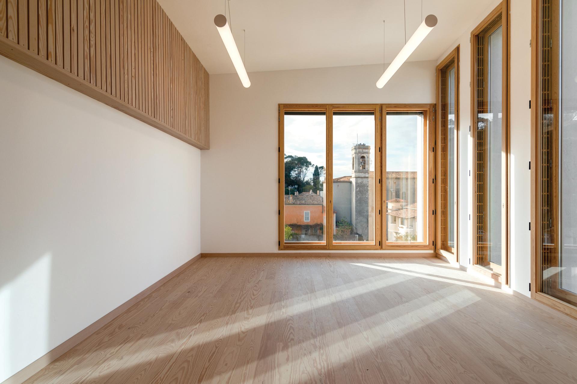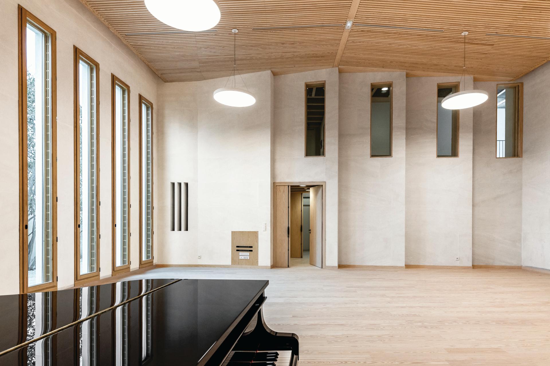 The public is greeted in an ample, well-lit hall sized for a veritable living space. It leads to the administration space and the teachers' lounge turned towards the calm of the patio, as well as the orchestra room. Its dimensions and direct access from the exterior make it a very functional performance hall. The mezzanine floor serves as a waiting area facing the orchestra room below while providing PRM access to seating. Circulations are generously sized on the floors and properly disposed so that very large instruments can be easily moved. Natural daylight makes for pleasant places to wait for the beginning of a course, meet with others or rest. The classrooms offer novel perspectives of the urban landscape, the church or distant contours of the garrigues.