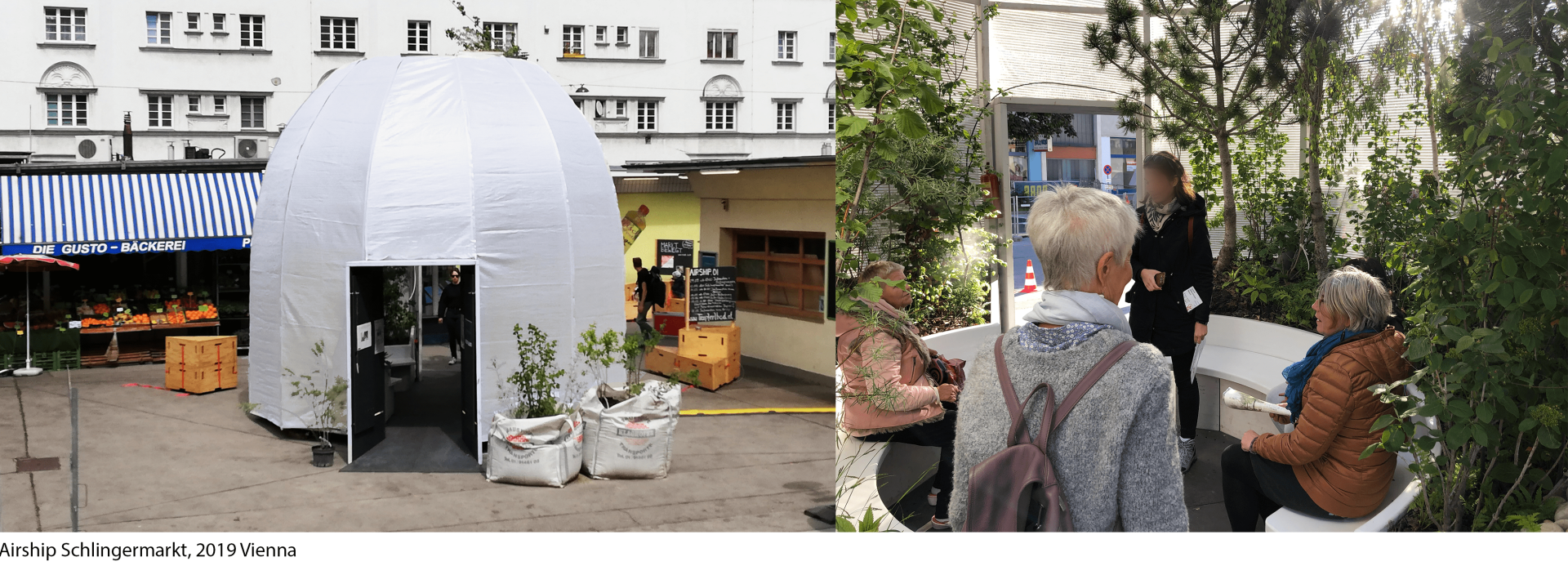 Right from the beginning of the project, the different stakeholder groups and local inhabitants have been addressed and motivated to participate. In addition to conventional survey methods and workshop formats, a mini demo object, a so-called Airship, has been installed at the demo-site and different place-making activities have been realised and monitored shortly after the start of the project. The Airship is a mobile climate installation of aprox 10m2 that is planted with an intensive piece of forest. Thanks to its intelligent architectural design, the Airship naturally cools the temperature up to 6 ° C and invites visitors to cool off, take a rest and visualize possible re-design options of the local demonstration site.