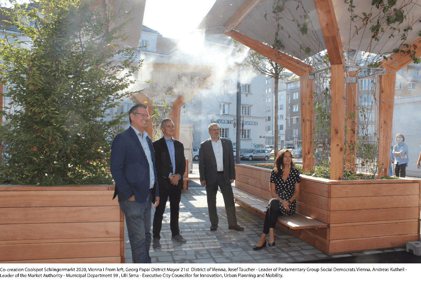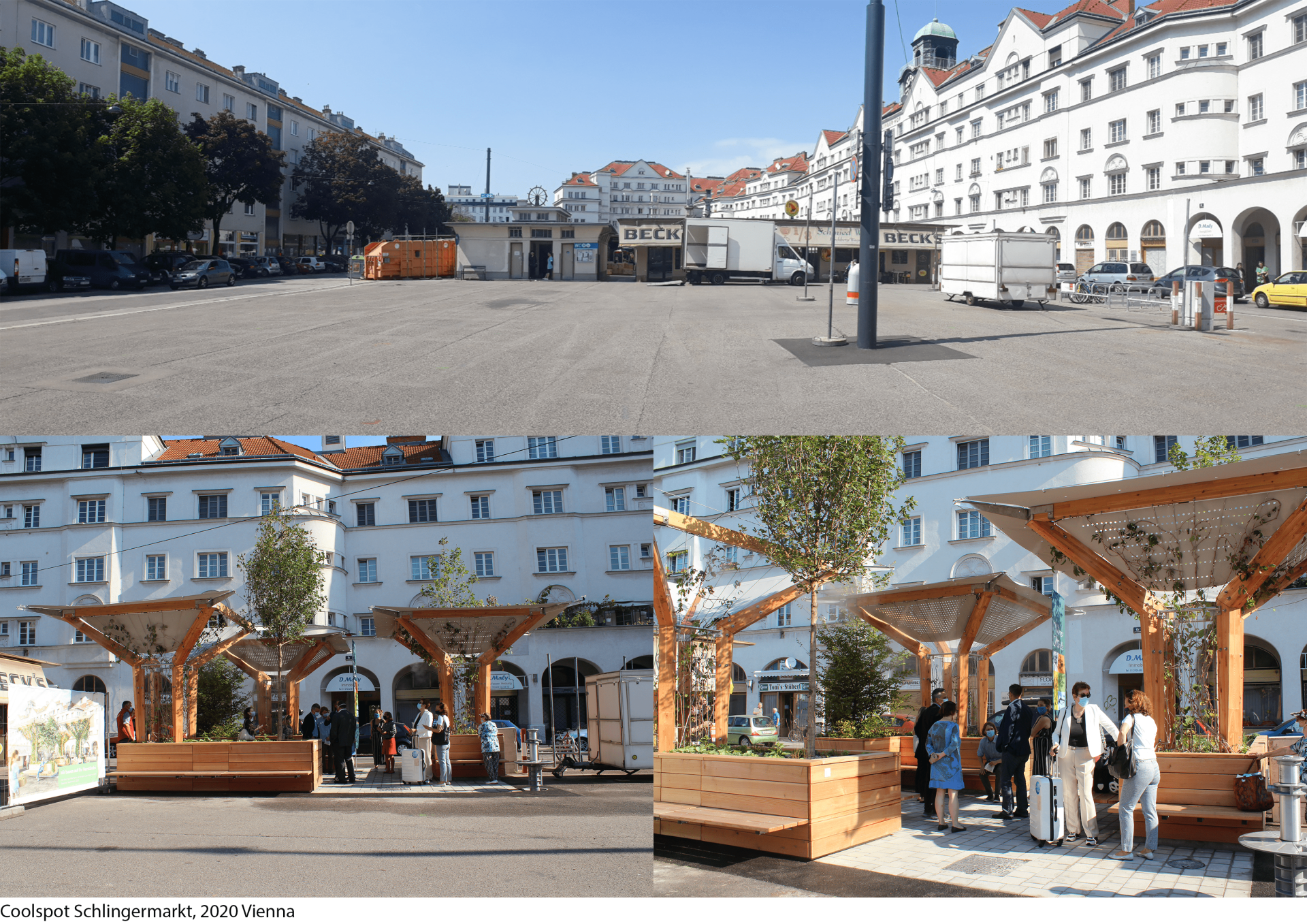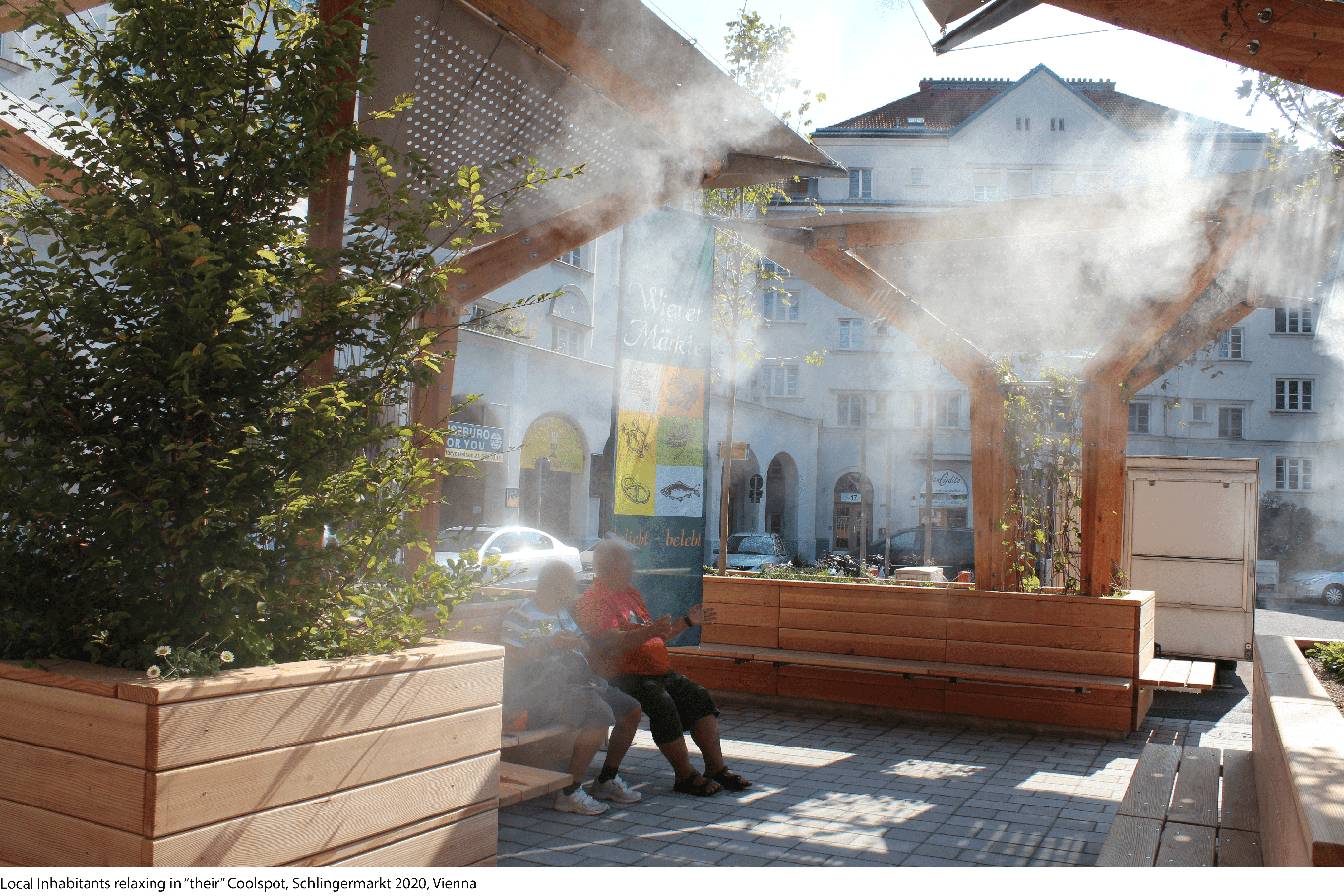 A healthy, cool urban climate is one of the most essential commons of our present society. Therefor the project goal is the creation of so-called coolspots, i.e. multifunctional cooling oases in the urban open space. The first phase of the project was the co-creative development and implementation of two prototypical demo-coolspots on two very different urban public spaces in two different districts in Vienna. Microclimatic simulation, material innovations and local energy production have been integral part of the project. The current second phase of the project aims to develop a concept for a citywide implementation of a European-wide coolspot network by providing guiding handbooks on the 4 planning pillars accompagnied by a presentation of possible classic and alternative financing instruments for local implementation.