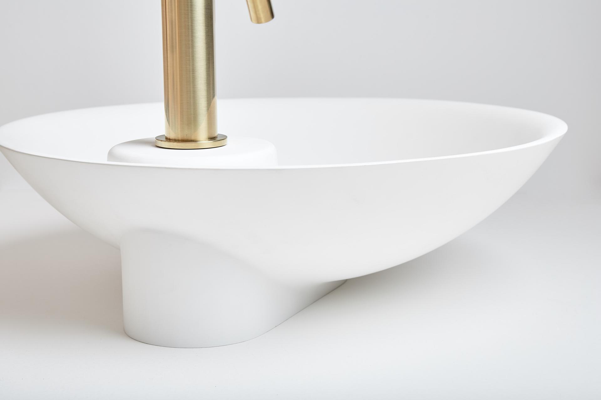 The slight elevation of the basin, due to its hidden pedestal, makes it appear to float, increasing its lightness even more and allowing it to be installed in a overhanged position if desired, unlike other conventional bowl basins. Its edge, softened on the inside, reinforces this light sensation and generates an expansive perception of being bigger than it really is and gives it a pleasant and sympathetic appearance.