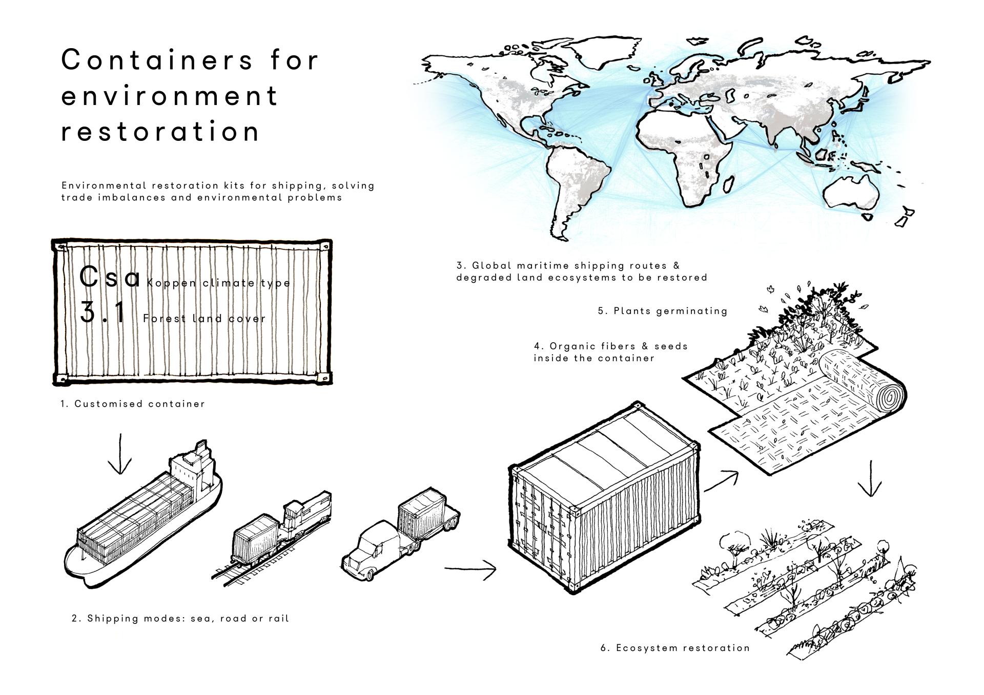 Shipping companies struggle with empty container relocation. This means that some regions have a growing surplus of containers. What could be packed in those containers to reverse environmental degradation? Ecosystem restoration kits would be carefully developed for different climate and land uses. With the contribution of different industrial sectors in the European Union, kits could be produced, packed and then shipped in these empty containers, for extensive ecosystem restoration.