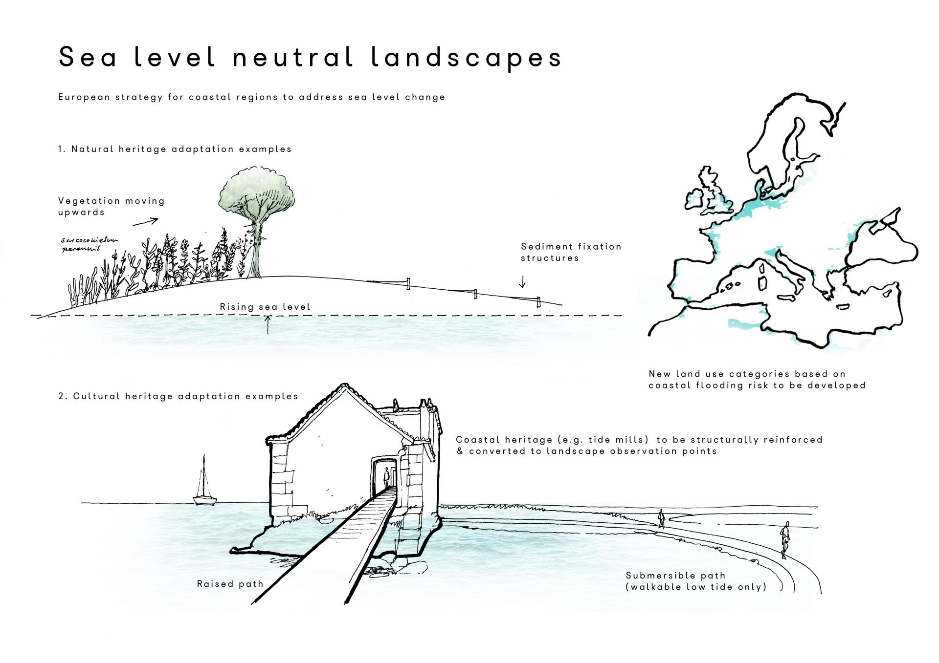 Sea level neutral landscapes are about environmental awareness. As people walk in, new questions arise about future possibilities with surging seas. Moreover, cultural heritage built structures irreversibly hit by coastal flooding should be structurally reinforced, then adapted to landscape observation points.