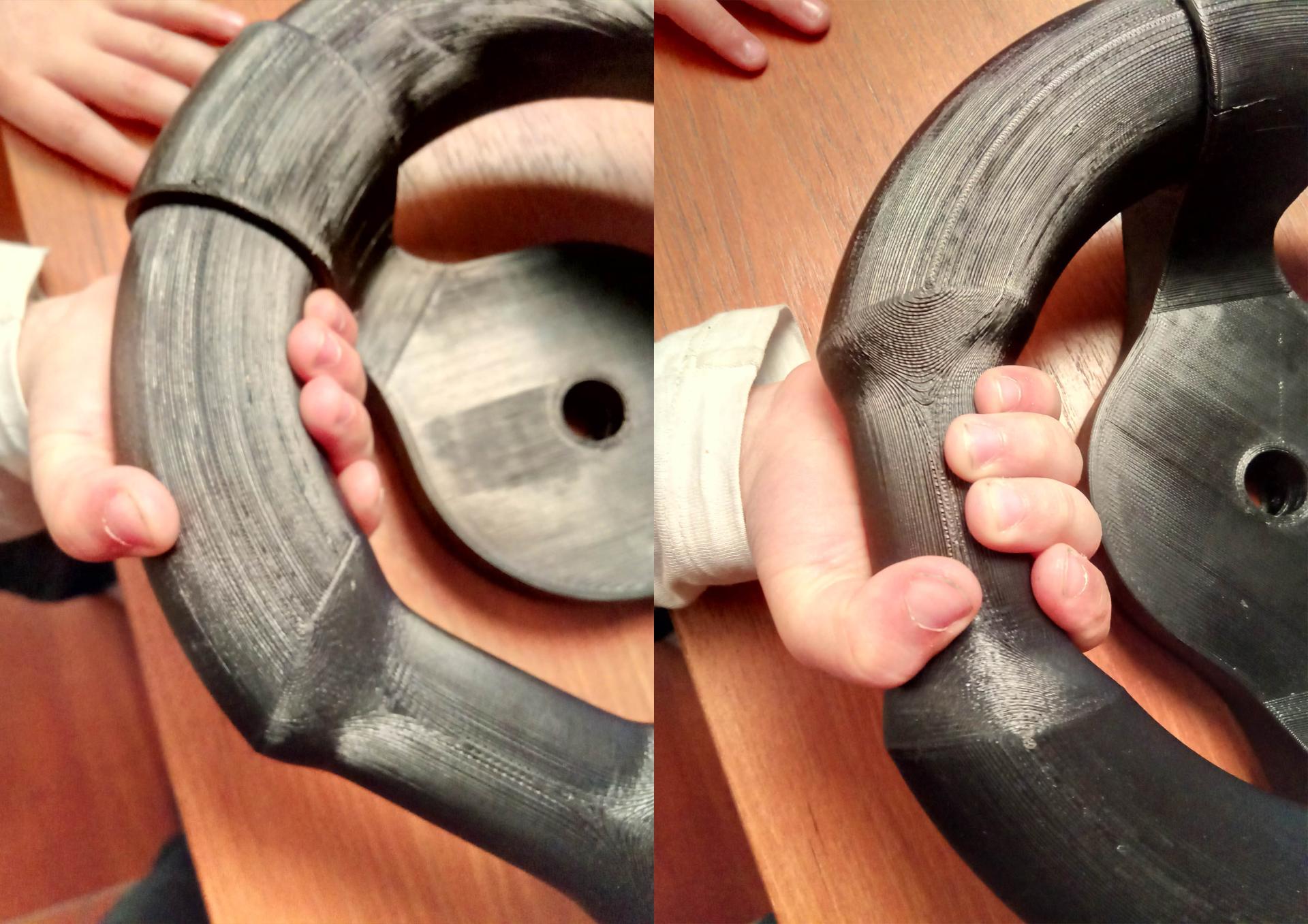 Observing these movements in a real climbing context (see photo) allowed identifying specific holds and the related characteristics that could stimulate them. The Jug hold is important for opening the hand and thumb opposition; the pocket and the undercut holds allow the elbow extension and prone-supination of the hand. It is also essential to prioritise symmetrical shape to encourage the CP children to approach with a two-handed grip. From these requirements, we designed a new climbing hold with a tubular body that integrates three types of holds: jug, pocket/undercut and tubular). The ACCEPT hold has a symmetrical circular configuration that can be rotated, offering the flexibility of use and stimulating different movements in the child. The hold's diameter is carefully designed based on the percentiles of children aged 6-11 to ensure friction force for a safe grip.