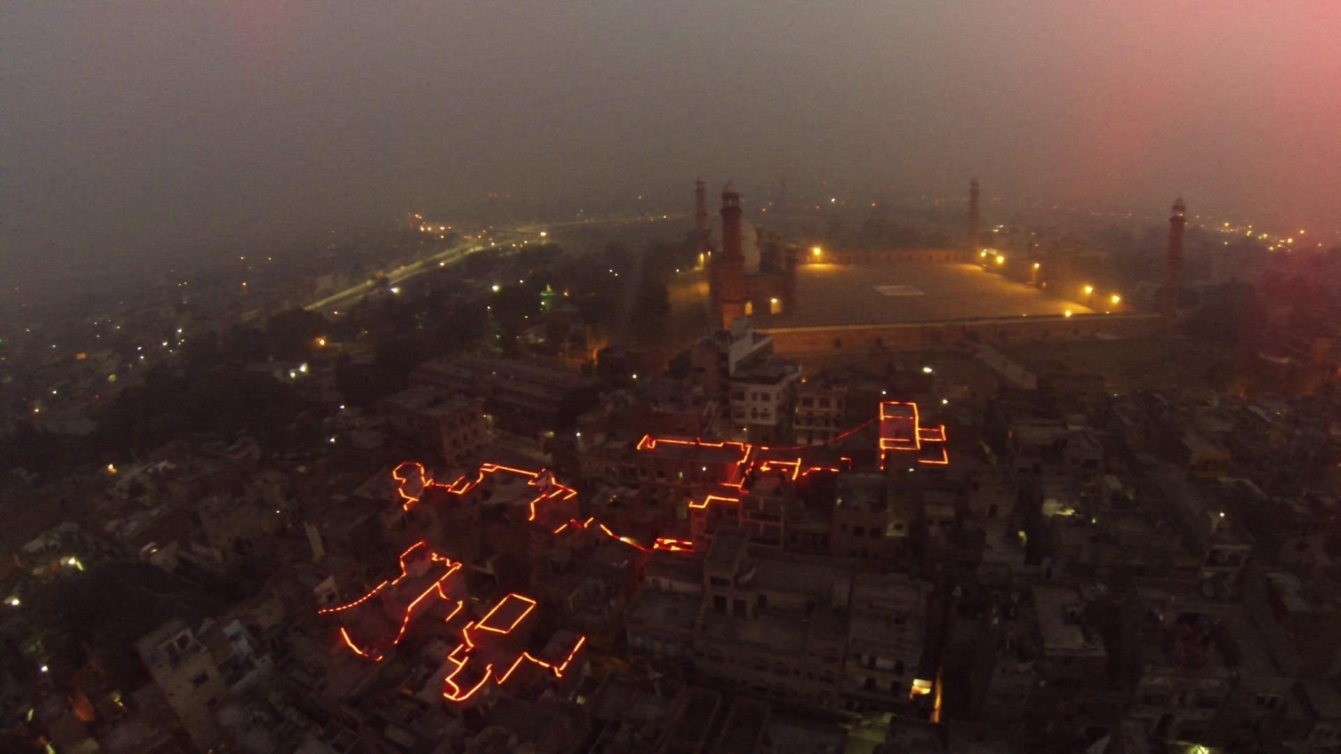 To respond to the questions put forward by PROJECT_16 and to raise awareness on the importance of preserving the old city's artistic beauty, the Awami Art Collective proposed Black Spring, a spectacular art installation in the historical centre of Lahore that consisted of a 2000m web of lights. The work connected the rooftops of the havelis of the Taxali Gate, one of the entrances of the Walled City that hosts the historical red light district. A film documented the process and the outcome of the project through breath-taking drone still and moving images.