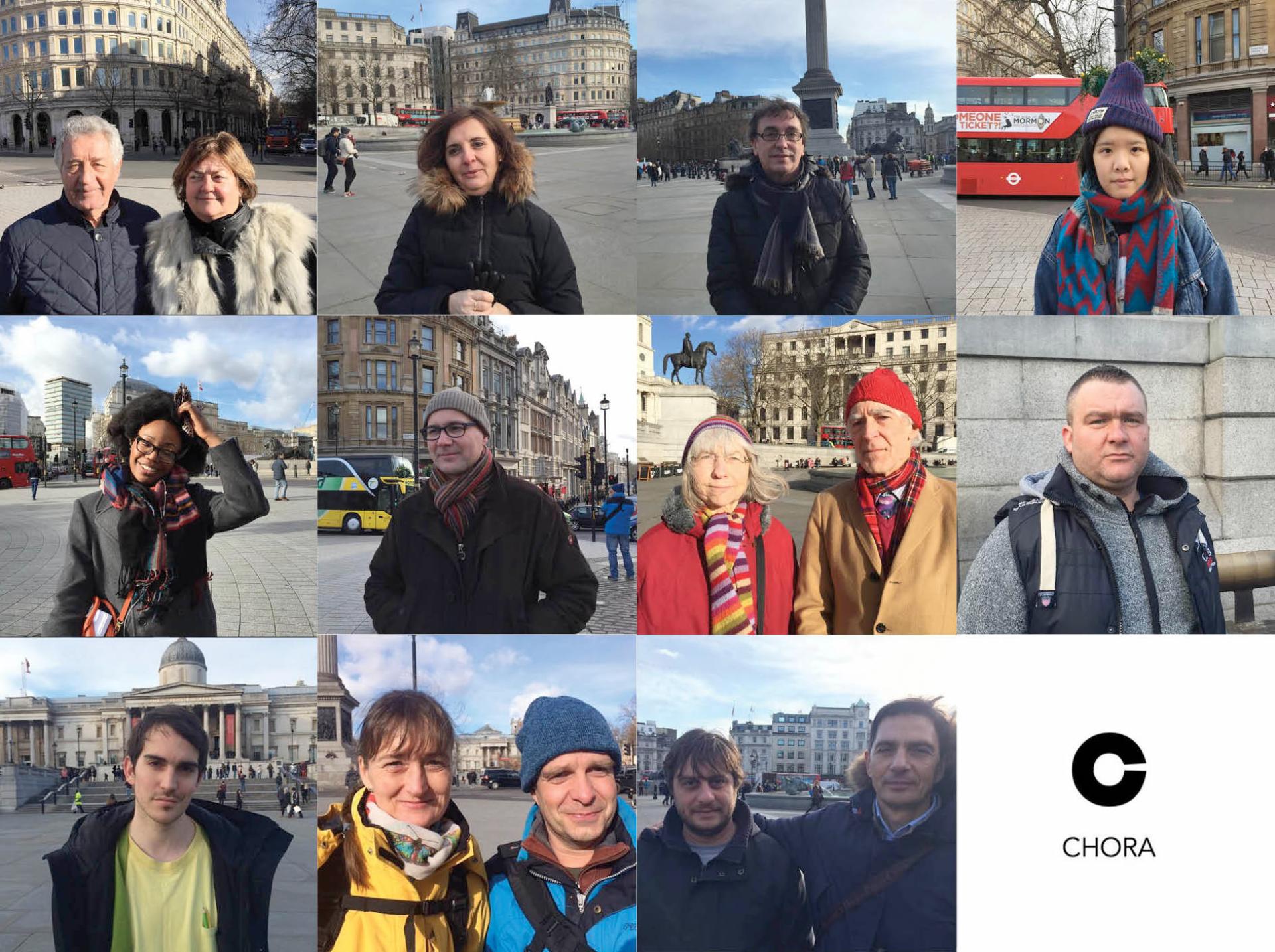 In London, taking the concept of cosmopolitanism as a starting point, Emma Smith proposed Chora. Composed of a performance in the streets of London, a workshop at the Royal College of Art and its online manifestation, the work was an invitation to reflect on our shared humanity. Chora was initiated in the iconic Trafalgar Square, the historic epicentre of imperial London from which all distances to other cities were measured.