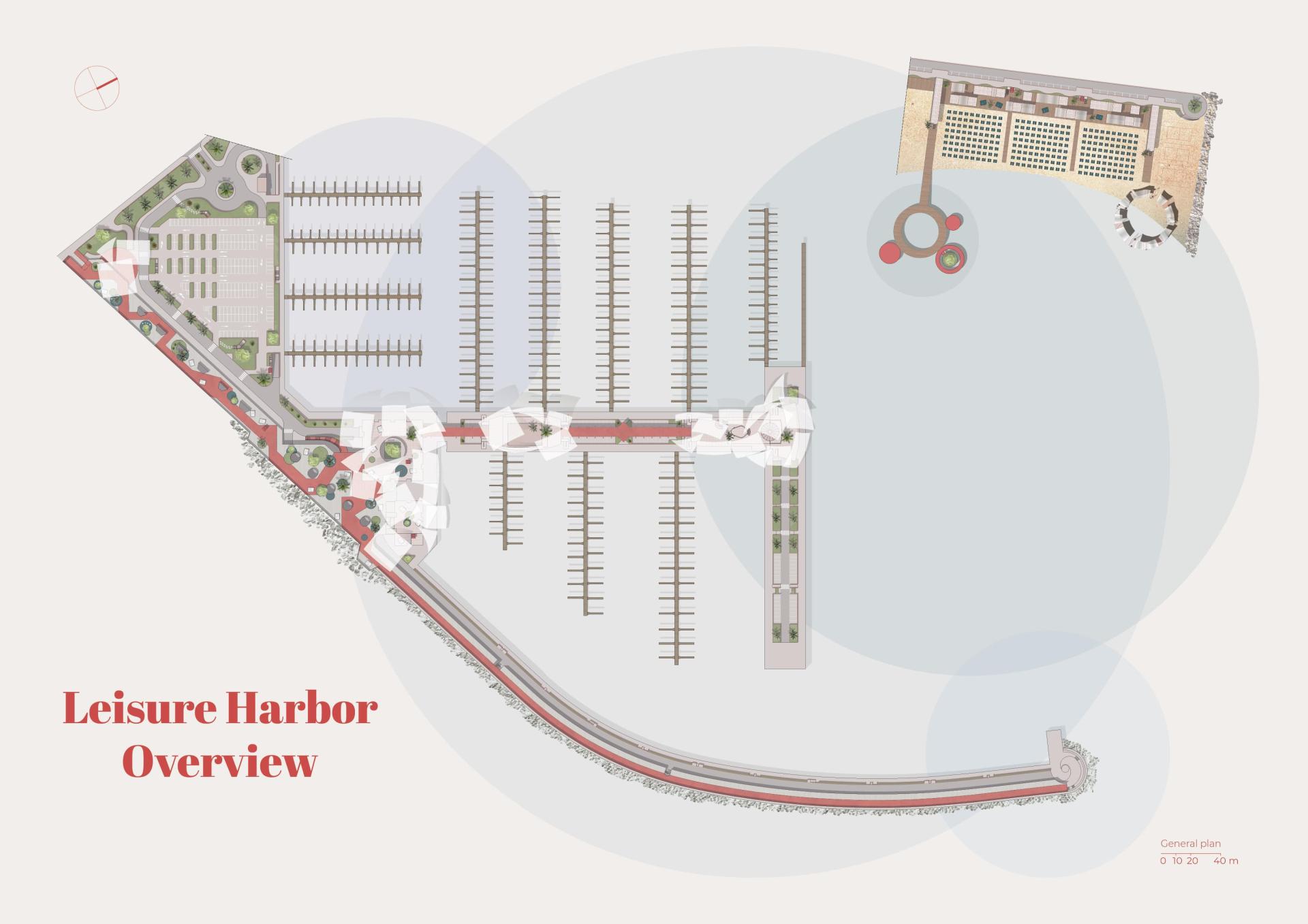 One of the fundamental themes of Leisure Harbor is Design for All. It means designing from people, all people, to ensure that everyone can enjoy the space with the same possibilities. In this perspective, the project focuses on a clear color code that offers an immediate and straightforward understanding of the environment. Notably, all access points, ramps, lifts, and walkways feature bright red, a complementary color to the green of the vegetation. Red is more easily recognizable (it is also the color of the town's flag!), while all parking spaces and seats are blue.