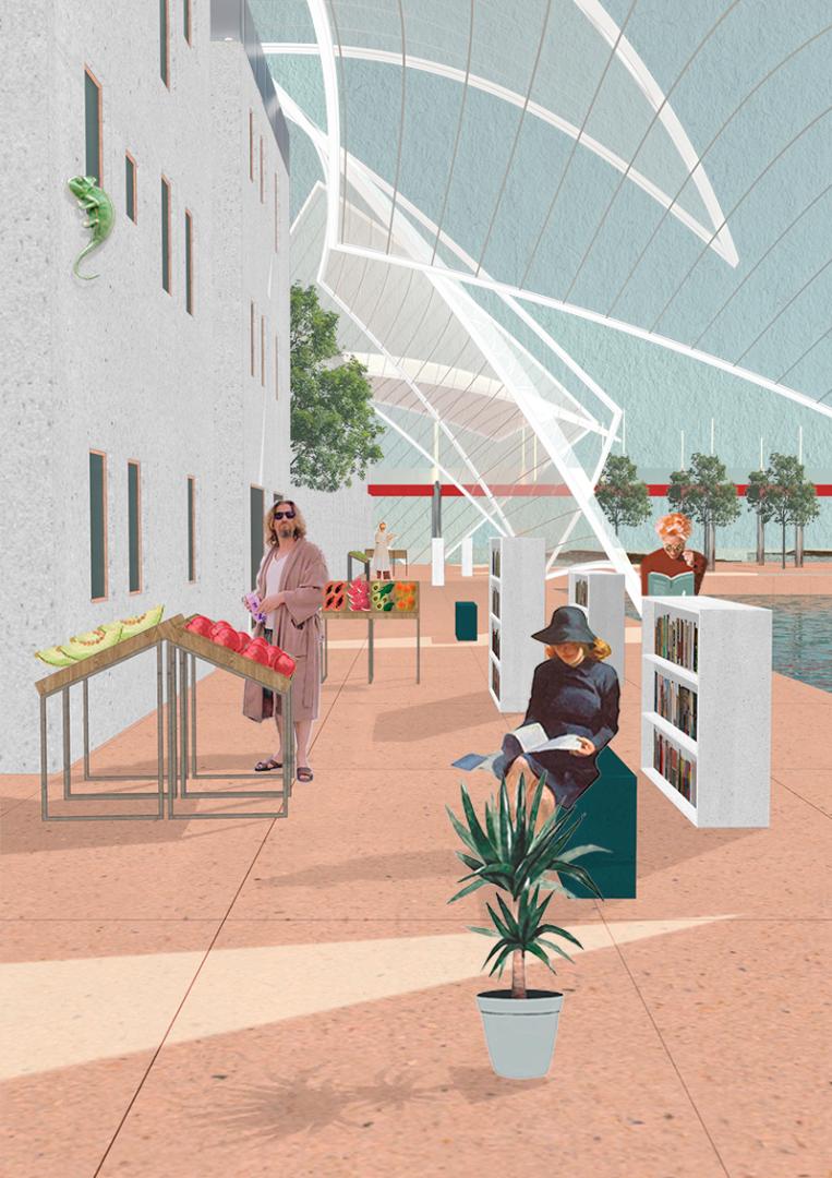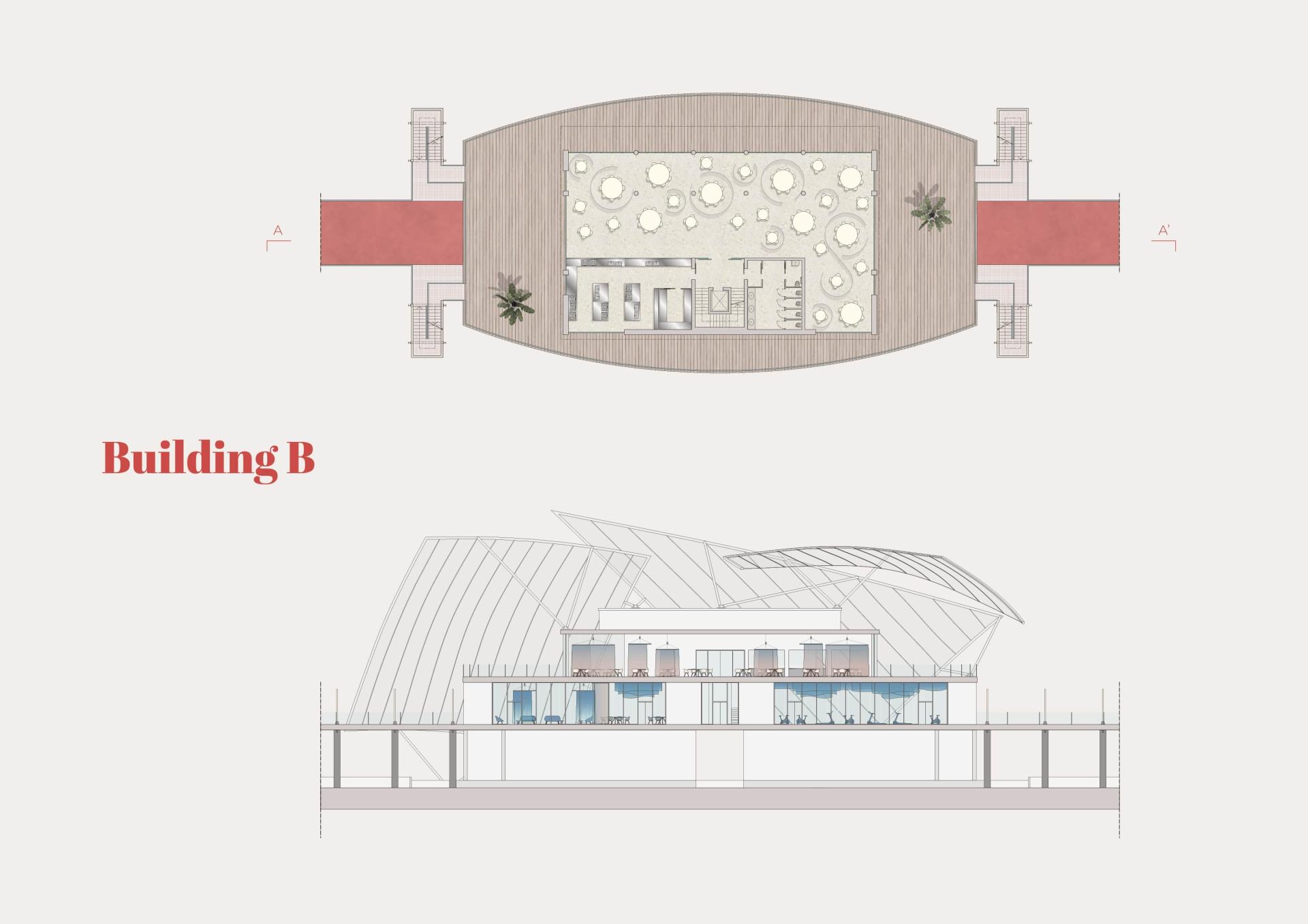 No existing buildings in the harbor are demolished, fostering an upcycling process in line with the environmental awareness of the project. All buildings are covered with polycarbonate “sails”, an intervention that requires minimal resources and will allow future minimum impact disposal since all the materials used are involved in a circular process. Additionally, the polycarbonate panels can be cut to the desired length during the production process, minimalizing the waste from offcuts produced during the on-site installation. Finally, polycarbonate panels can be manufactured with recycled material and are fully recyclable too.