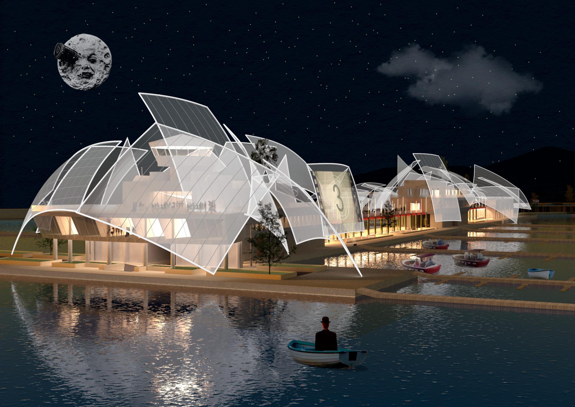 In the port, where boats come to rest and form a forest of masts, the architecture offers open sails, swollen with wind and dreams. These sails seem to move because they reflect the sea, balancing and embracing the all-around space. Not only do they symbolically represent a former way of exploring the world, but they are also a statement of technological progress and digital world integration into architecture. Sails are unfurled towards the future.
