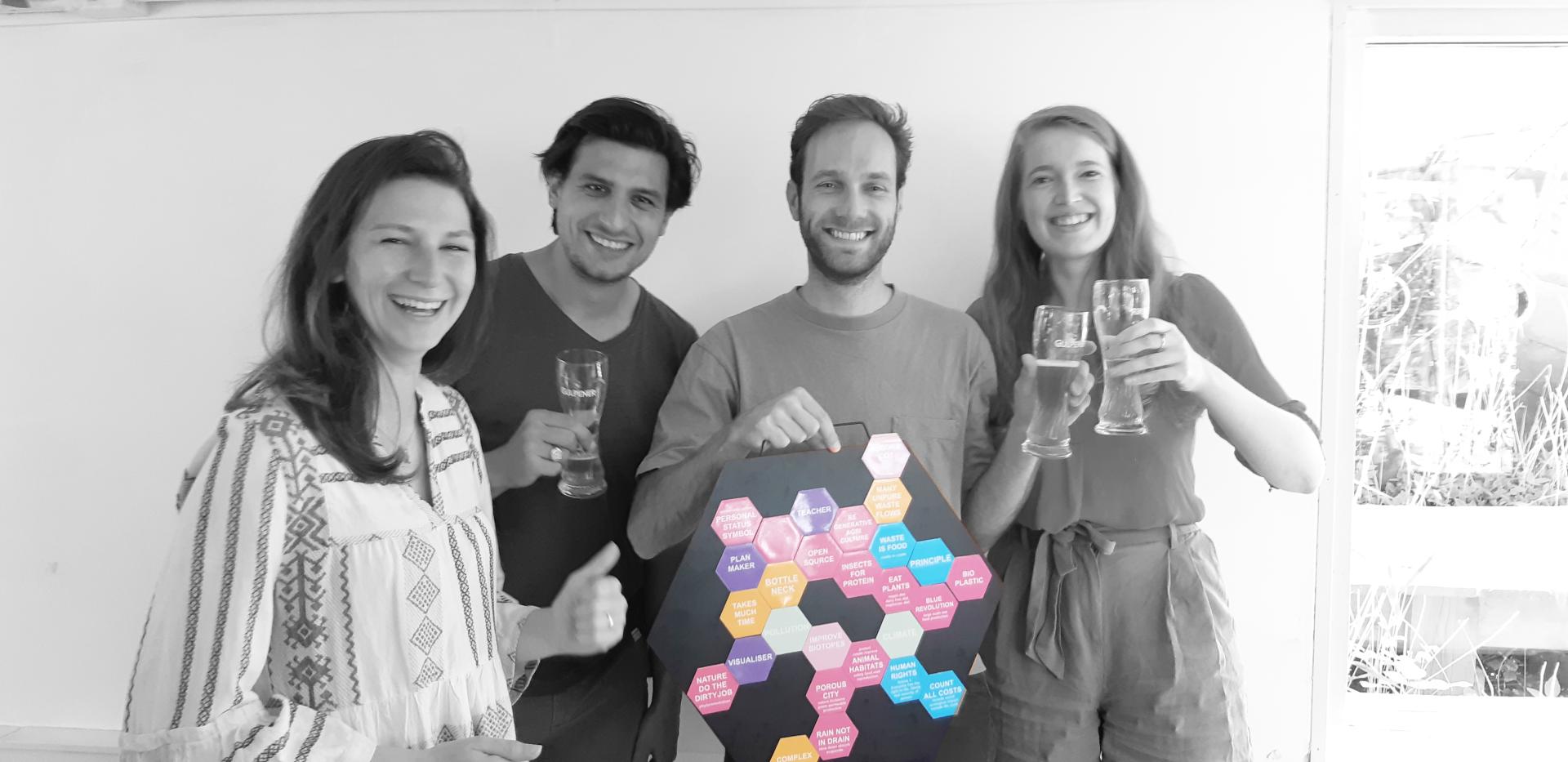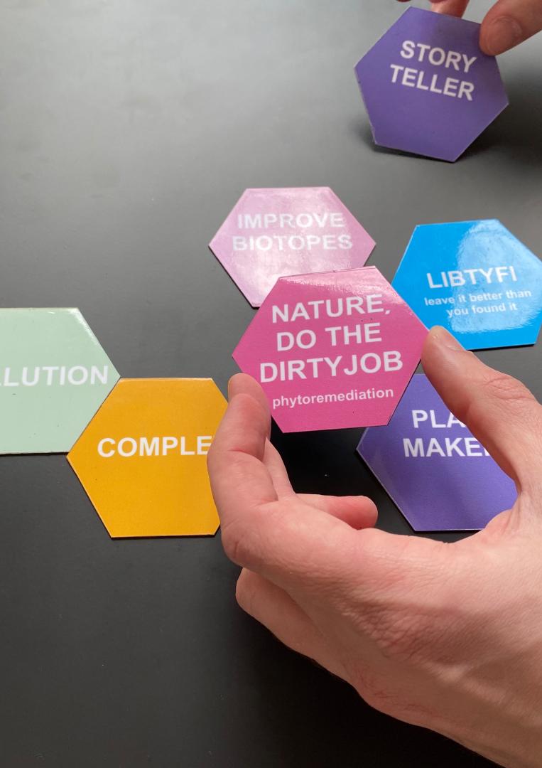 These teams simultaneously play a concentrated board game, which facilitates the structured design and construction of the ‘DNA’. The ideas are linked, enriched, contextualized, sharpened, and teams compete for the ‘winning’ project DNA. Team members help each other, get all categories on board, and create one DNA structure. More and more bottlenecks are solved and the DNA is elaborated further. The one who touches most sides of the hexagon and solves most bottlenecks wins.