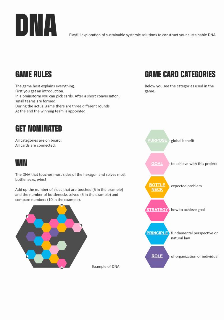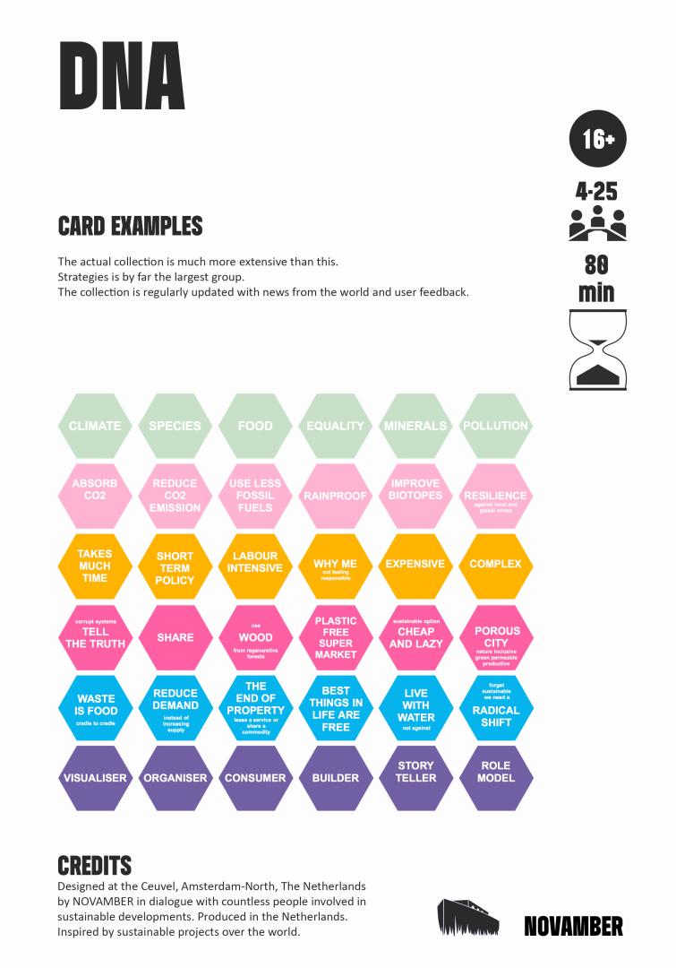 Sustainable purposes, goals, principles, strategies and effective roles in sustainable systems (change) are harvested from projects in all sectors and disciplines all over the world. Typical bottlenecks are included. It is poured into colourful game cards that you can hold, move and stick on a board. Players are invited to complement this set with their own desired DNA game cards.