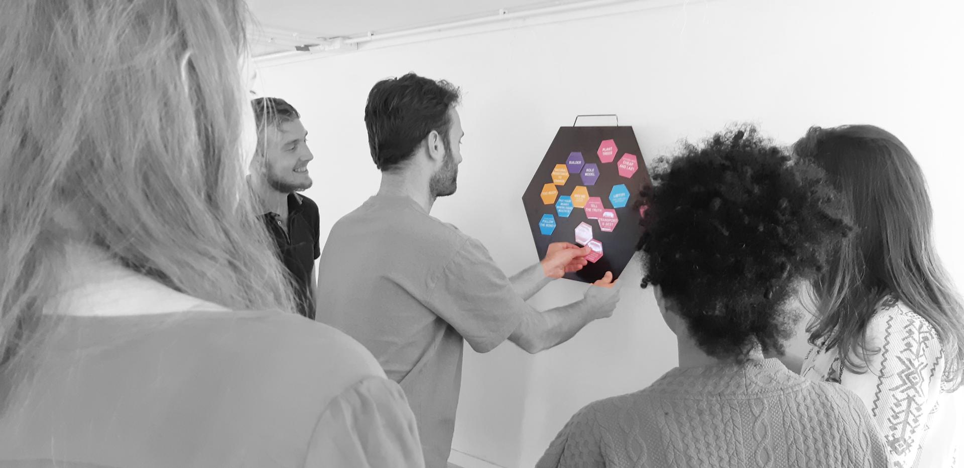 It opens up perspectives, enriches, educates, diverges and converges into an action plan. Playing this game is a way to get to know the sustainable DNA, and to immediately apply it to ones own organization / practice. The game provides space for ventilating and articulating individual ideas, for helping each other, and to create a project DNA as a team.