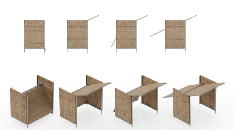 The cabin itself is a basic structure, which gives shade and a place for personal items. The frame is made of galvanized steel which is a durable material making a contrast with the annually regrowing reed.