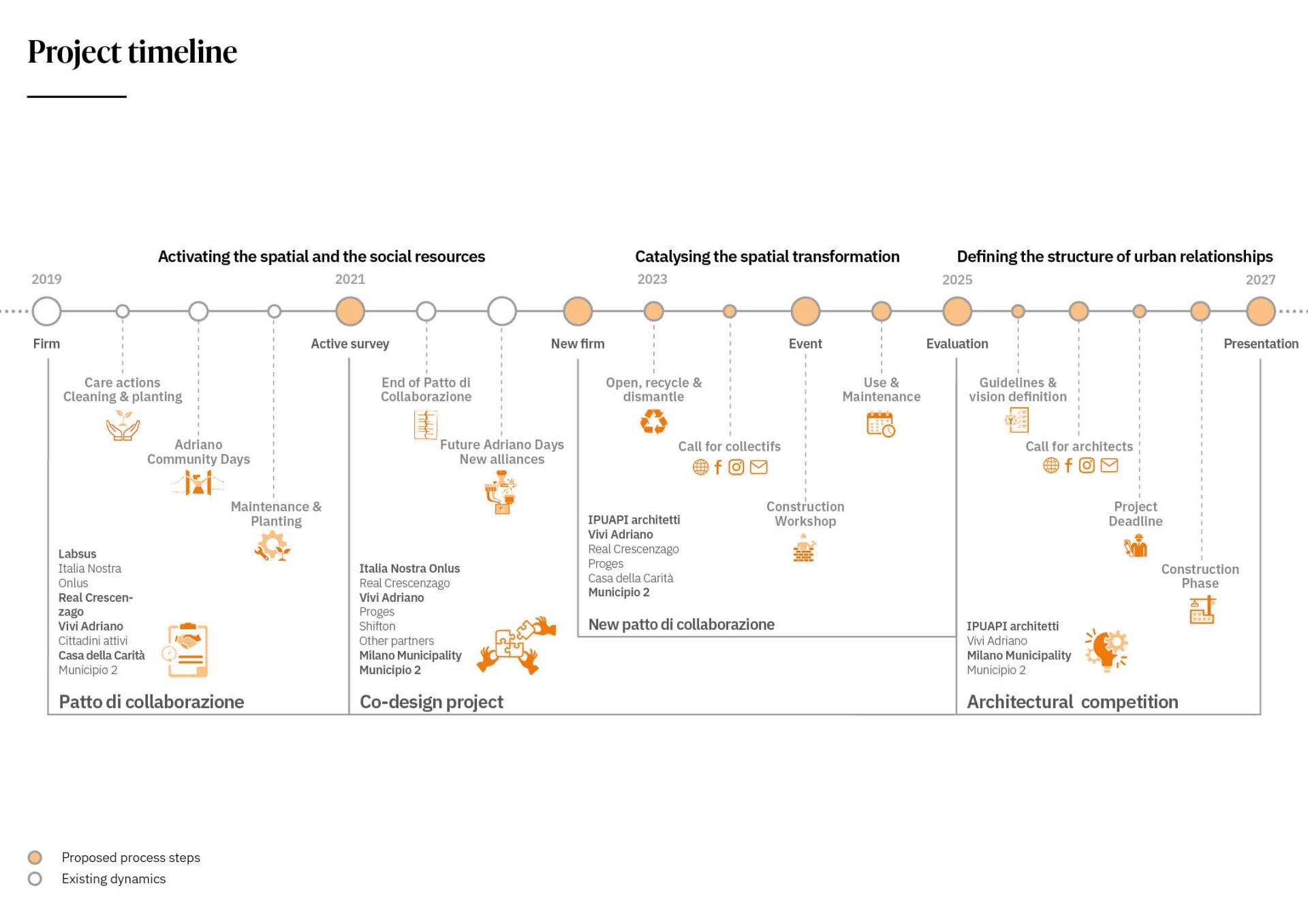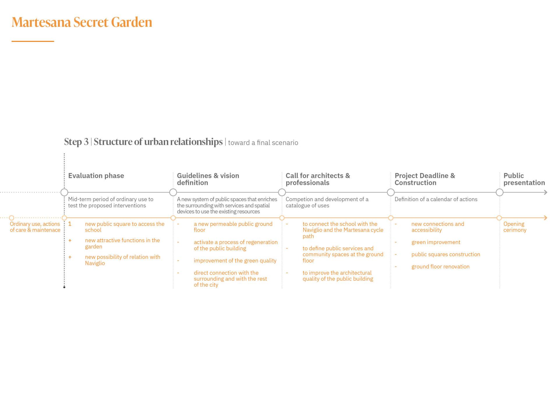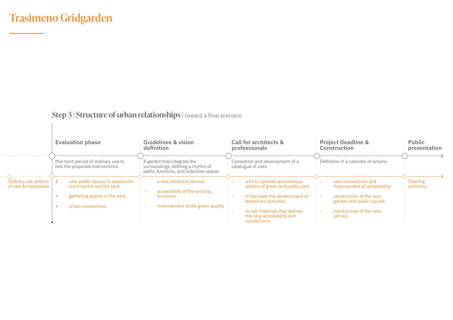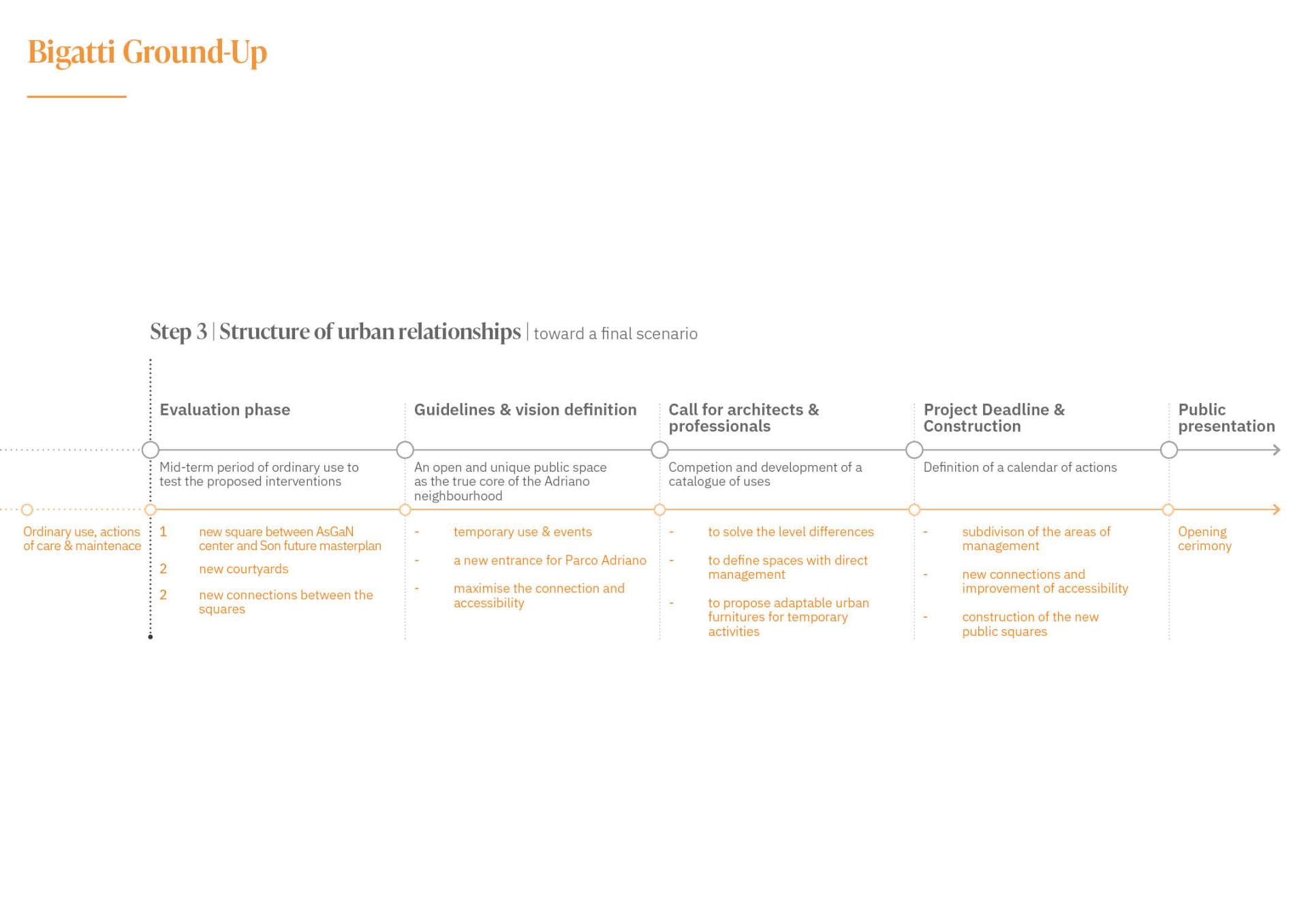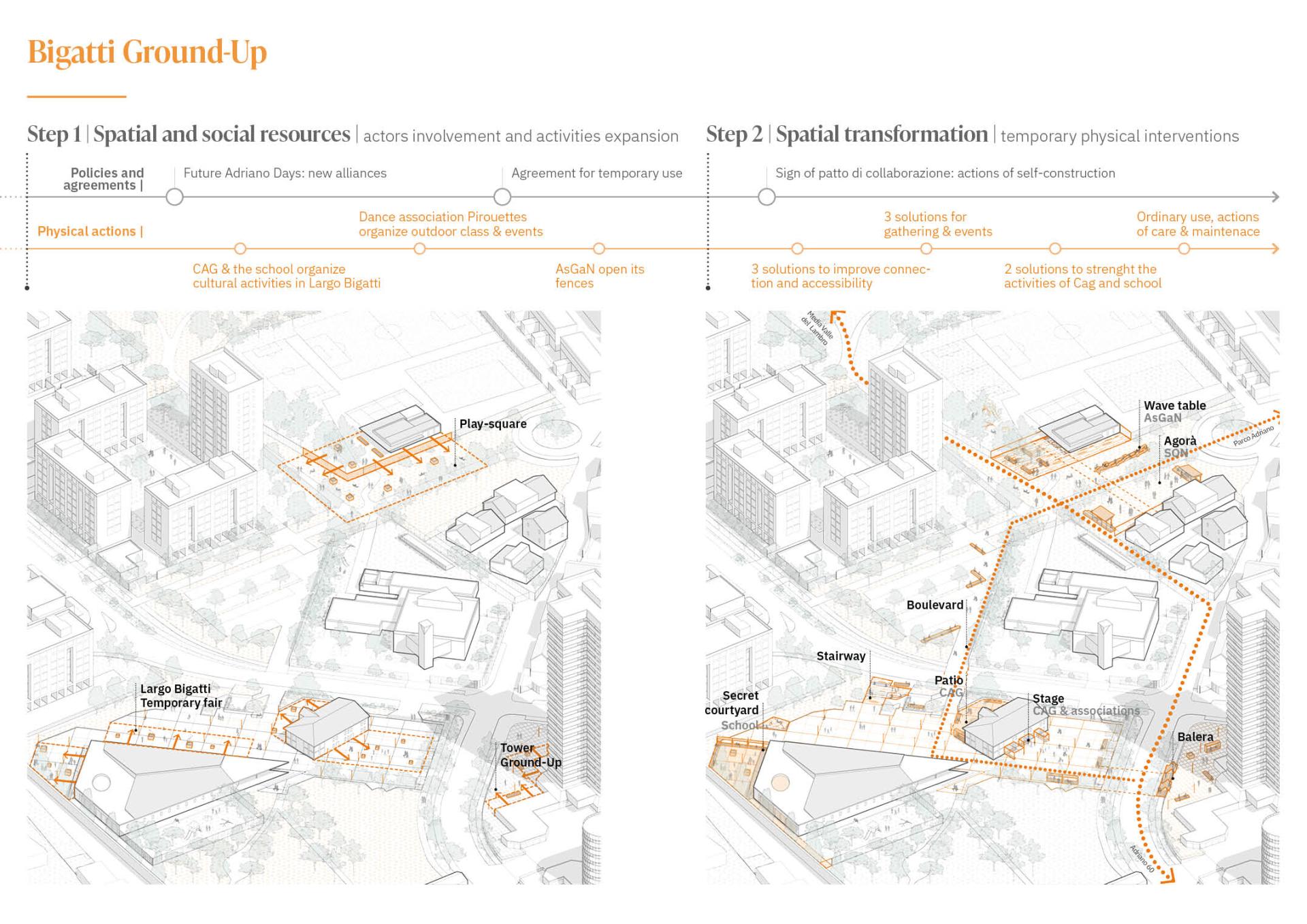 It consists of the development of project transitional phases, in which short-term interventions scattered in the territory can catalyse the spatial transformation that can renovate a whole urban system structurally and permanently. A sustainable participatory project helps to create a domino effect, triggering actions and funding to redevelop awaiting areas, from interstitial spaces to significant public spaces. All those actions could prepare the way for future steps with a potentially disruptive regenerative effect.
