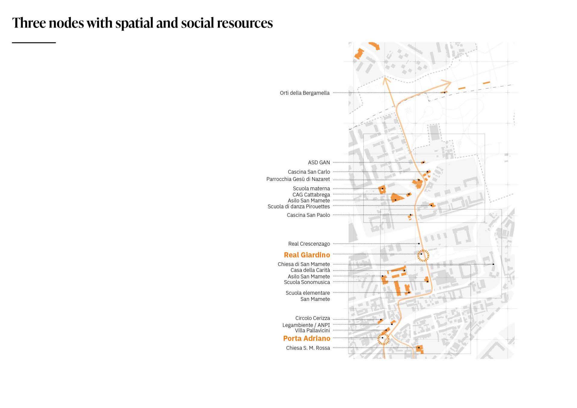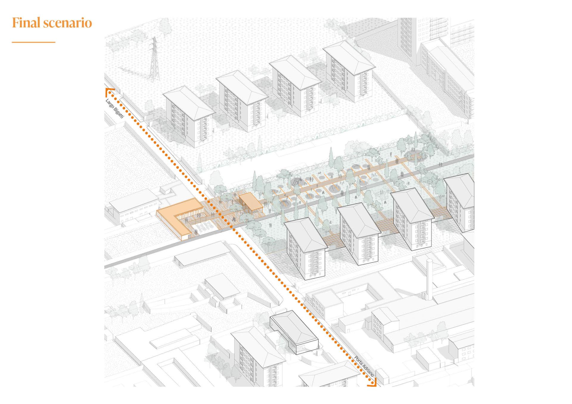 Adriano is a recent urban reality, characterized by incompleteness, and spatial dispersion. However, this contrasts with the presence of many actors and collective functions active on the territory. It emerges a territorial vocation to enhance green areas re-appropriation and the dimension of open public spaces.