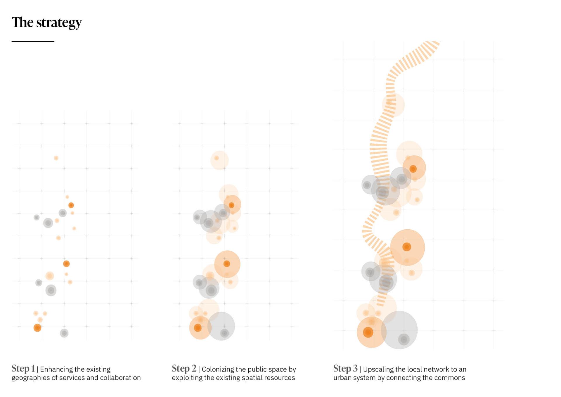 As a third step, the system is upscaled. From a transitional phase of the project, in which small short-term interventions catalyse the spatial transformation, some interventions become permanent and able to modify the urban structure in which they are set. In this way, new urban relations are established, and public space gains new value, enhancing, in turn, the value of the urban environment itself.