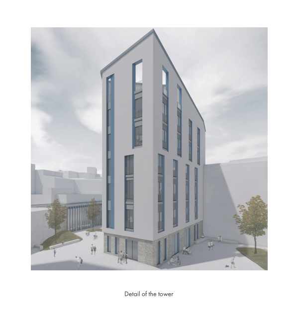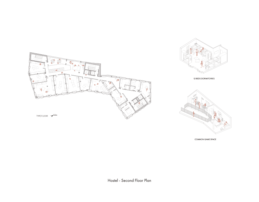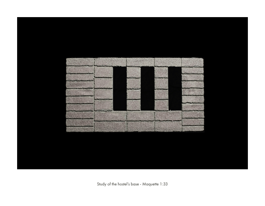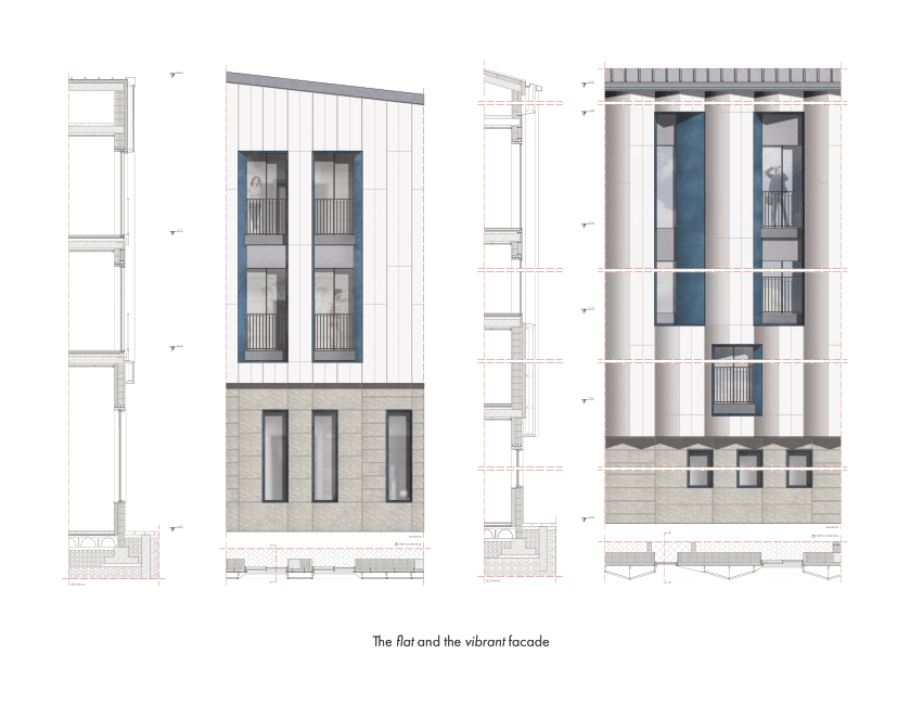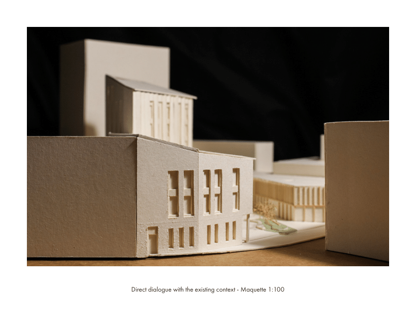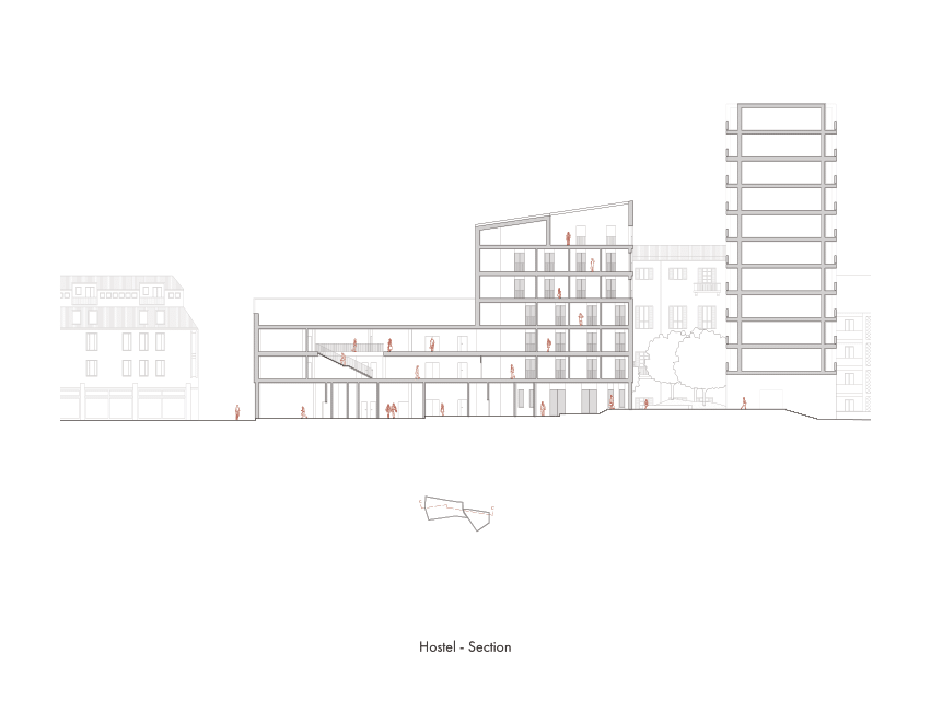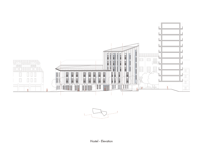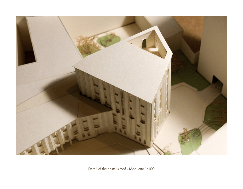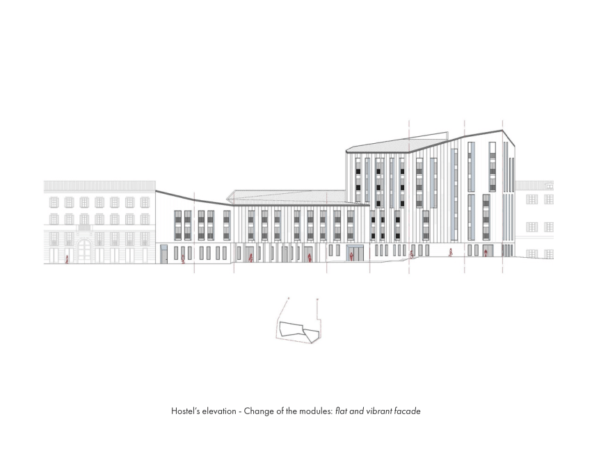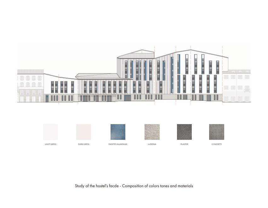 Moreover, the hierarchies of the façade of the surrounding buildings such as the base, the intermediate wall and the inclined roof terminal, are found punctually in our design. Starting from an ashlar base, the hostel looks for a new solution for the intermediate wall, proposing a vibrant facade. Large panels in stoneware undergo formal deformations in their development: starting from the use of the linear module in the joints between the existing facade and the new one, it changes through the use of the triangular module, animating the elevation with a play of light and shadows. Interfacing with the vacuum maintained within the context, this solution emphasizes the presence of this new place offered to the community.