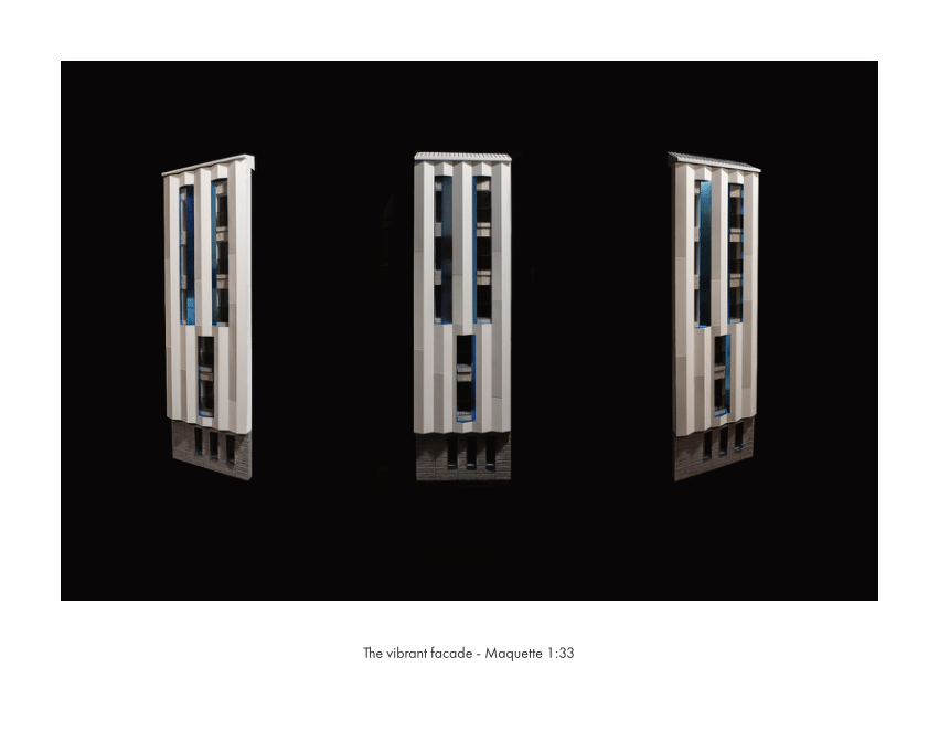 The study of the facade, aesthetically speaking, becomes one of the main project's themes. Studying the architectural style of the context, we noticed the importance of developing a well-proportioned facade’s image, that is controlled by a precise module. This element allows the definition of proportions and rhythms. First of all, we worked on the concept of the relation between solids and voids, which is enhanced by the presence of a blue metal sheet, defining also the frame of the windows.