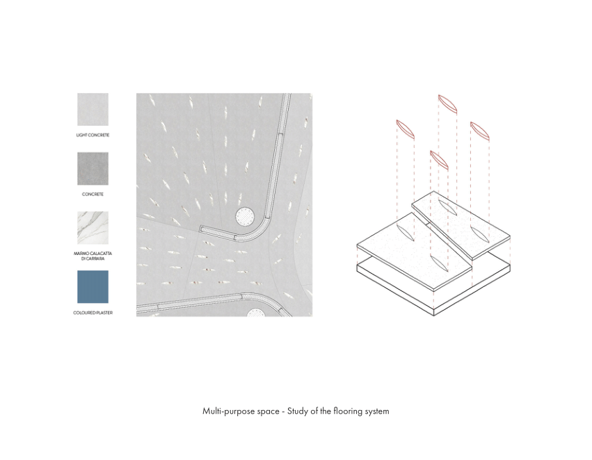 In addition, an innovative character can be identified in the design of the multi-purpose space where the will to represent a natural environment, such as the river, has declined in a work of abstraction of the latter. Therefore elements such as the flux of water, rocky seabed and trajectories of fish have been transformed into architectural elements such as walls and concrete floors of different tonality characterized by white marble inserts.