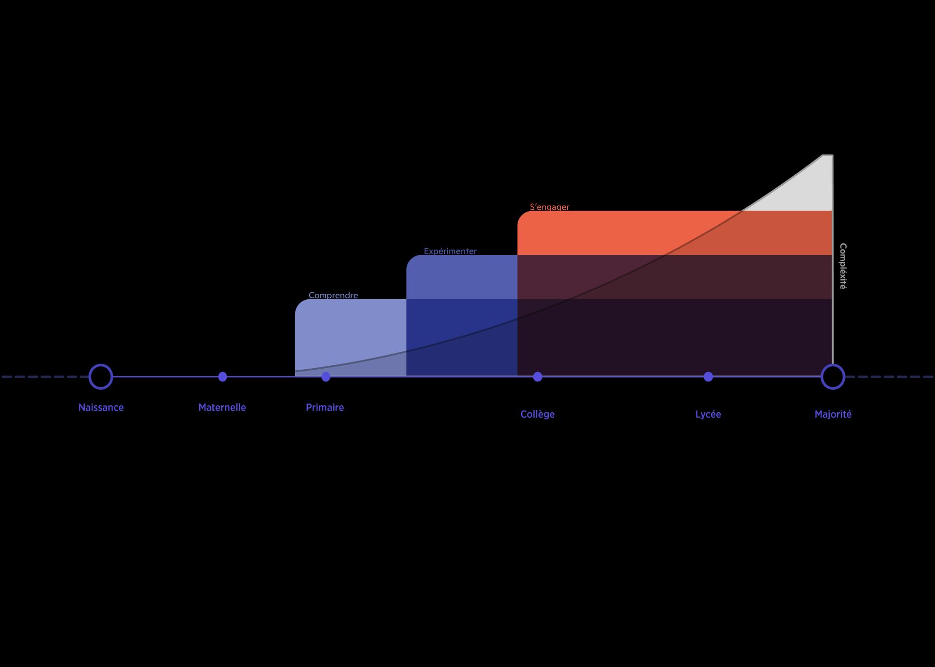 The program unfolds over the long term in a progressive manner from kindergarten to high school. It is based on an active pedagogy where each theme is developed in three phases: