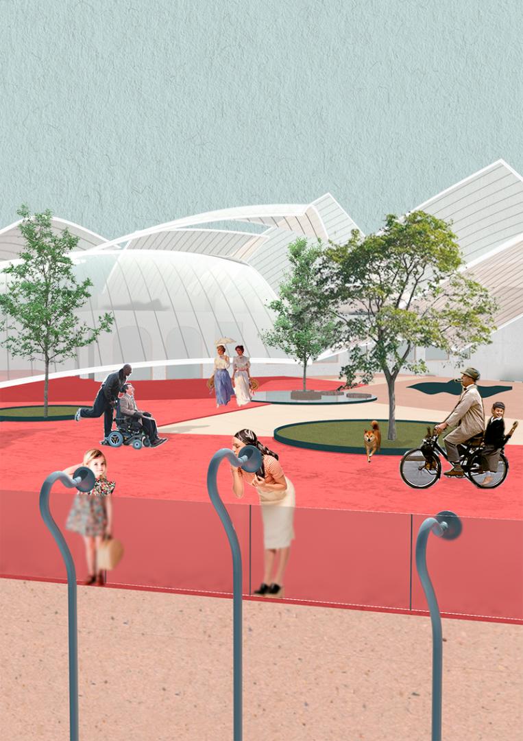 Leisure Harbor aims at offering an experience of reconnection with the sea through the careful aesthetic design of the space and the creation of unique experiences. A sensory experience distinguishes each building, with the "sea-sound walk” being the most unique and innovative one. If the project aims to reopen a dialogue with the sea, why not talk to it directly? Our suggestion seeks a more intimate and unusual experience, made possible by iron poles that reach from the cliffs to the promenade, echoing the roar of the waves crashing against the rocks. The intervention dialogues with the natural context and intertwines with its forms, generating a new space of relations between the sea and the people. We conceived the public space as a place of participation and an intimate encounter with the unknown.