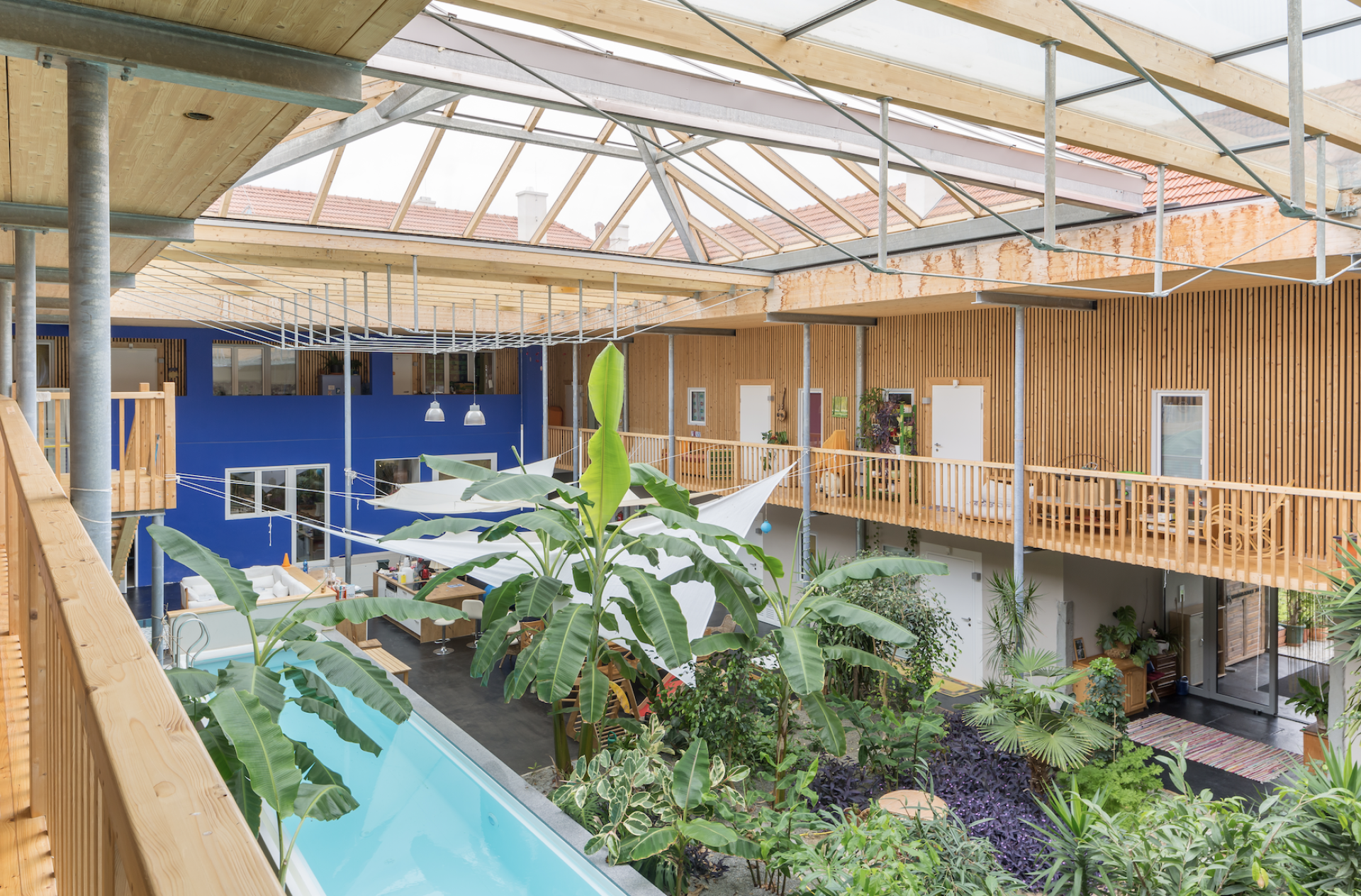 Many of the courtyard buildings of monasteries and farmers will no longer be needed in the future, such as the listed 550-year-old manor in Garsten. With the sustainable concept of "Protect by using", the inner courtyard was covered with a mobile glass roof that captures solar energy, and 22 apartments were built into the old structure to enclose this winter-proof atrium. 110 m2 winter garden, a 20 m swimming channel and a shared kitchen make this social environment a new home worth living in.