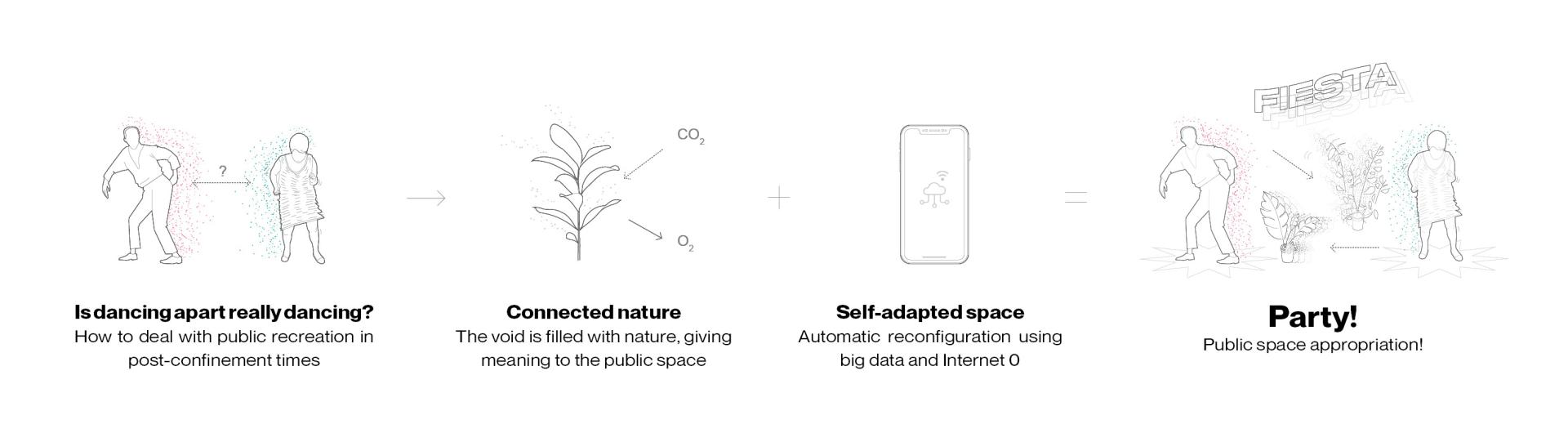 But, in the ongoing health crisis, what happens to an activity based on agglomeration? We must find a party model compatible with a delicate social and sanitary situation. Social distancing creates a void between us destined to be unused, but why not take advantage of it to fill it with nature? We are given the opportunity to shape the future, and we cannot imagine one that does not go hand in hand with technology and nature.