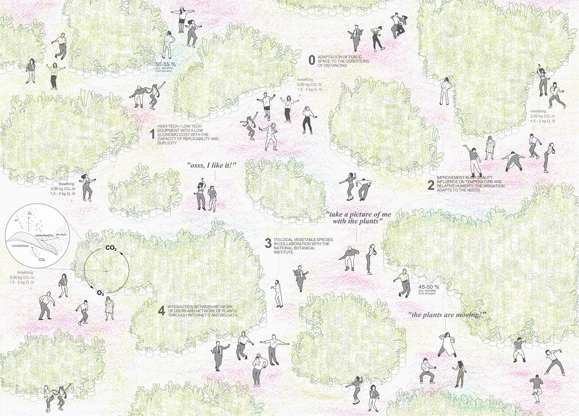 Rather than tackling sustainability from a material point of view, we tackle it from its basis; we do not build. However, we propose an infrastructure that allows building communities through the use of vegetation. Through the inclusion of plants in our project, we provide the necessary elements to foster new social encounters and experiences.