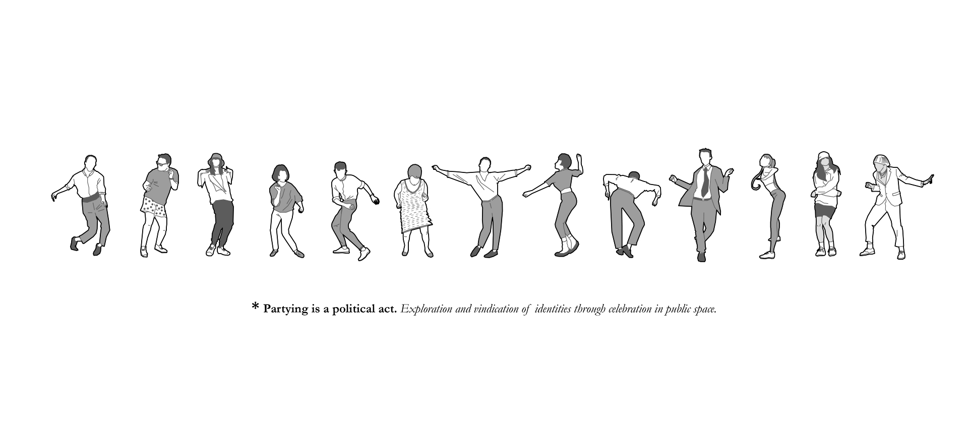 Parties or celebrations of any kind are a backbone for identity claim and public representation for communities of different sizes and nature, becoming an essential political tool for visibility and a driving force for social change. Not as a frivolous gimmick, but being aware of the crucial role of partying and dancing in expressing and reaffirming community identities through collective celebration and occupation of the public space. We understand partying in public space as a political act.