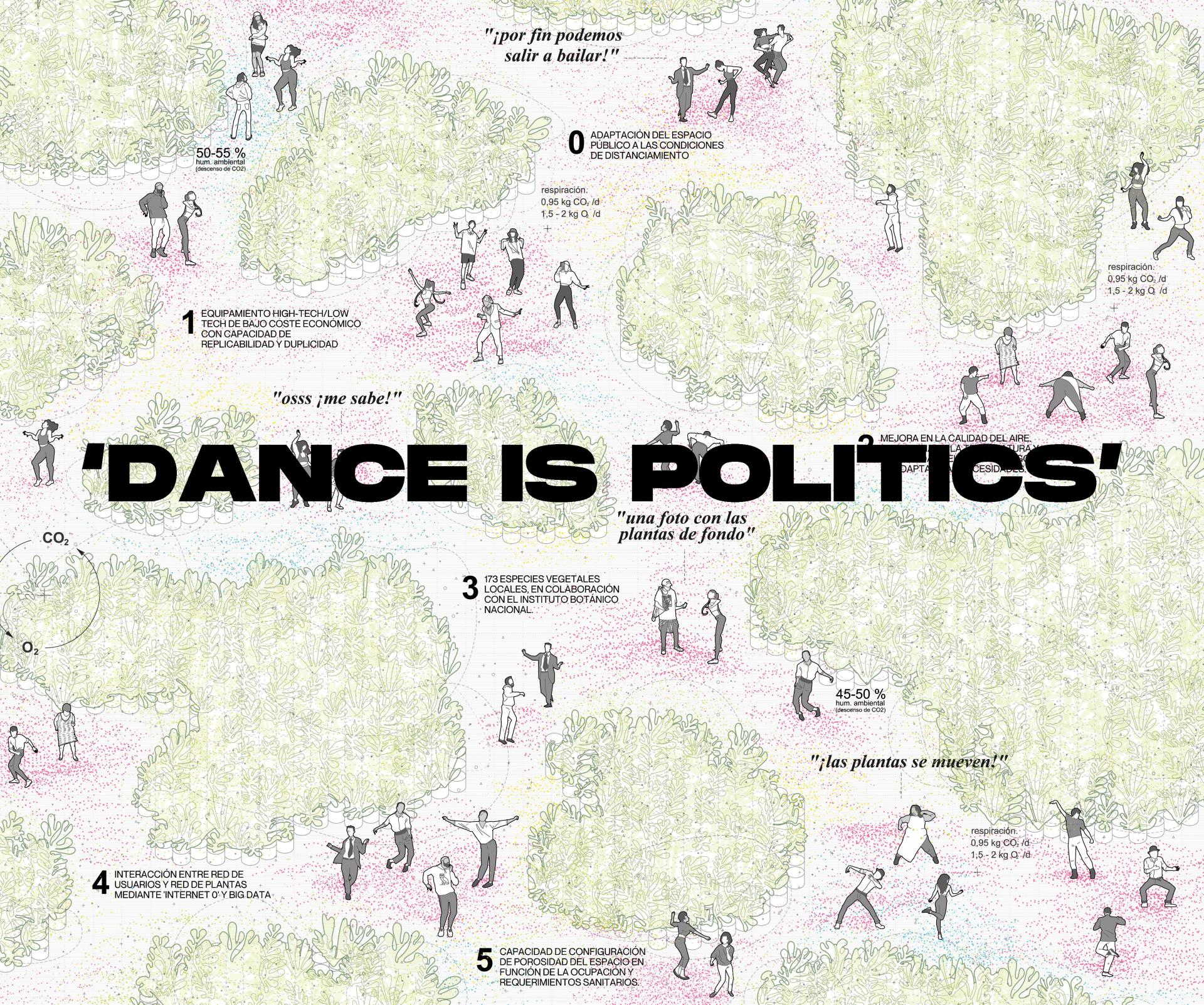 DANCE IS POLITICS is an idea easy to build, with just a few components: people, music, plants, and the desire to dance. We propose a system made of a physical component and a virtual one in continuous feedback. The physical part is a system of pots that move automatically to create various groupings of vegetation to limit agglomerations and ensure social distancing. The virtual component consists of a central system for analyizng and managing the data collected through sensors, which transmits information in real-time to each pot on where to move in the urban space. The units that comprise the system are flowerpots: mobile elements that consist of vegetation, wheels, and a micro-computer, which allows their automation and directs their movement, following the central system's orders to which they are connected wirelessly. The information generated and collected in each of the public spaces creates an open-knowledge network, enabling the system to adapt to any public space and to any budge