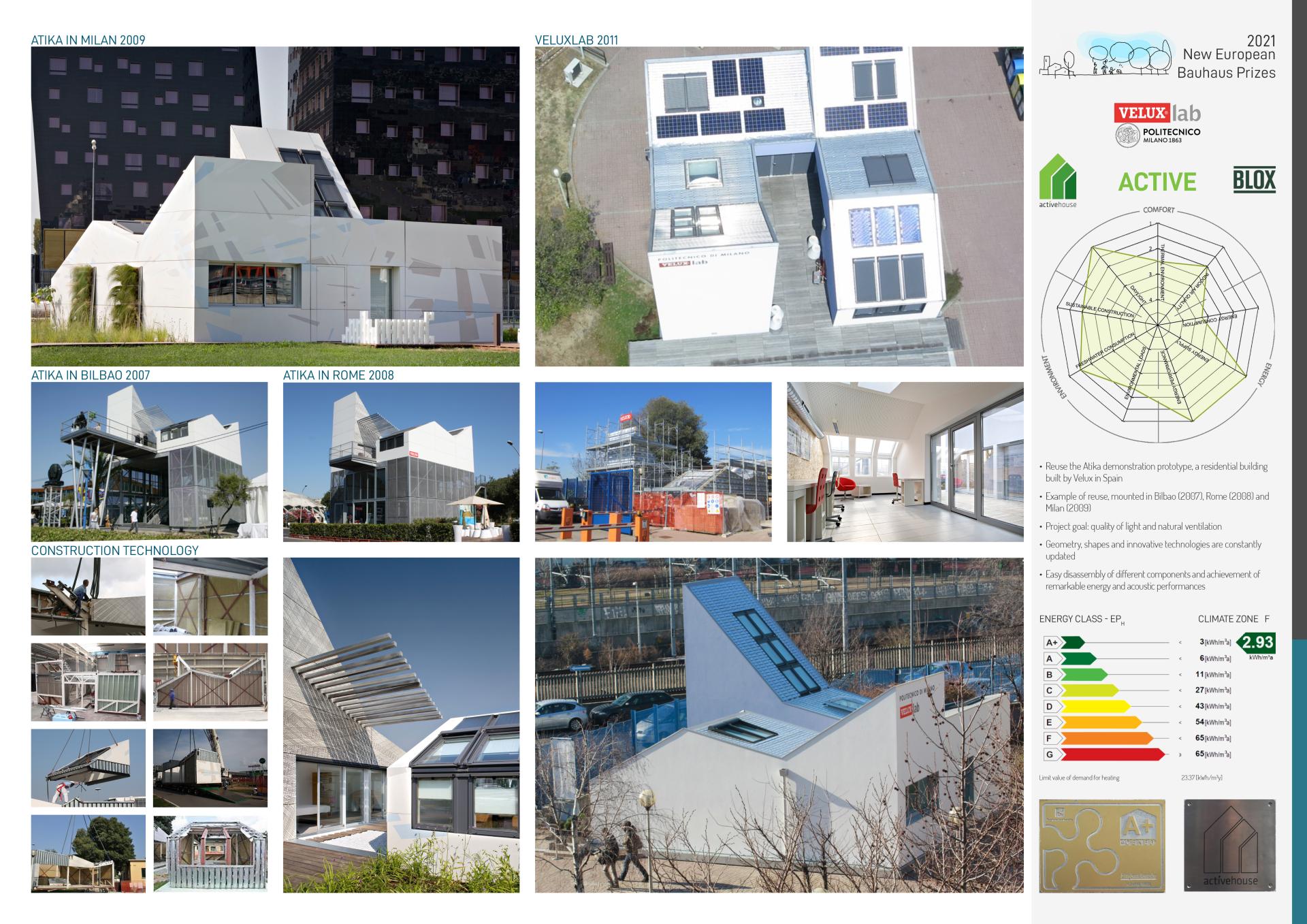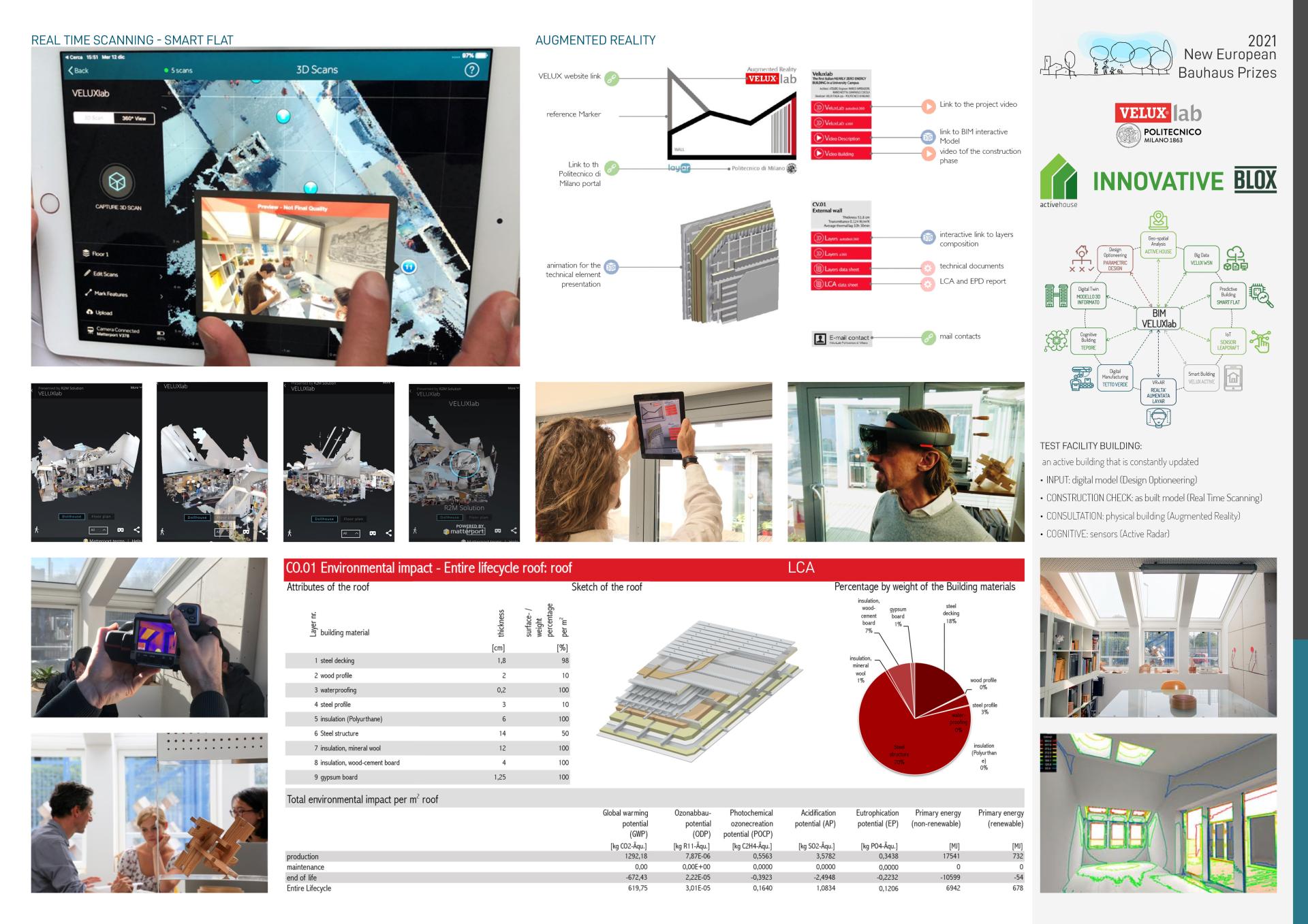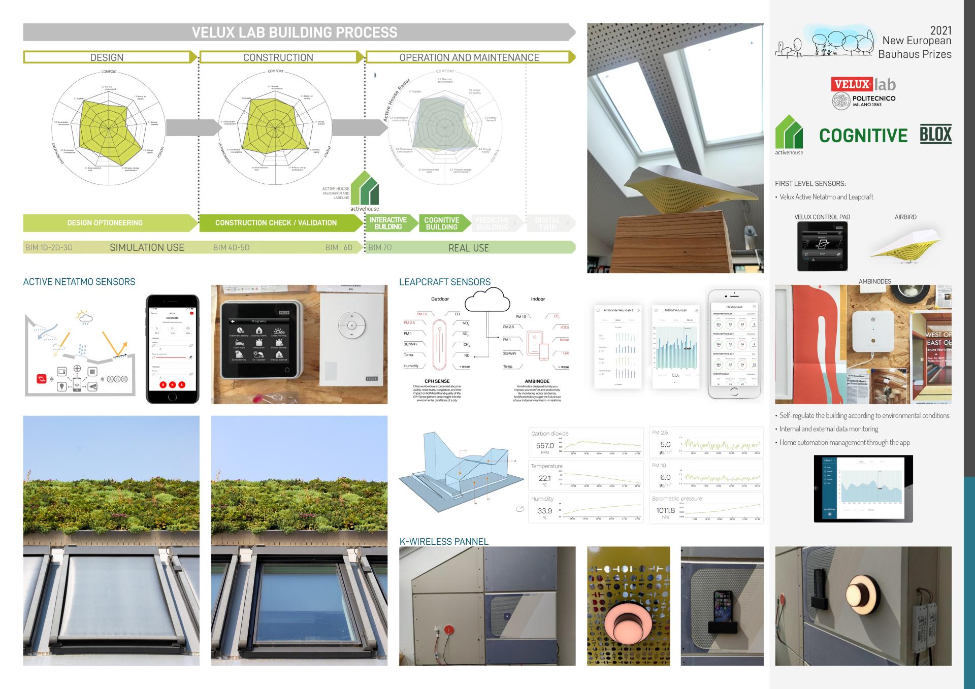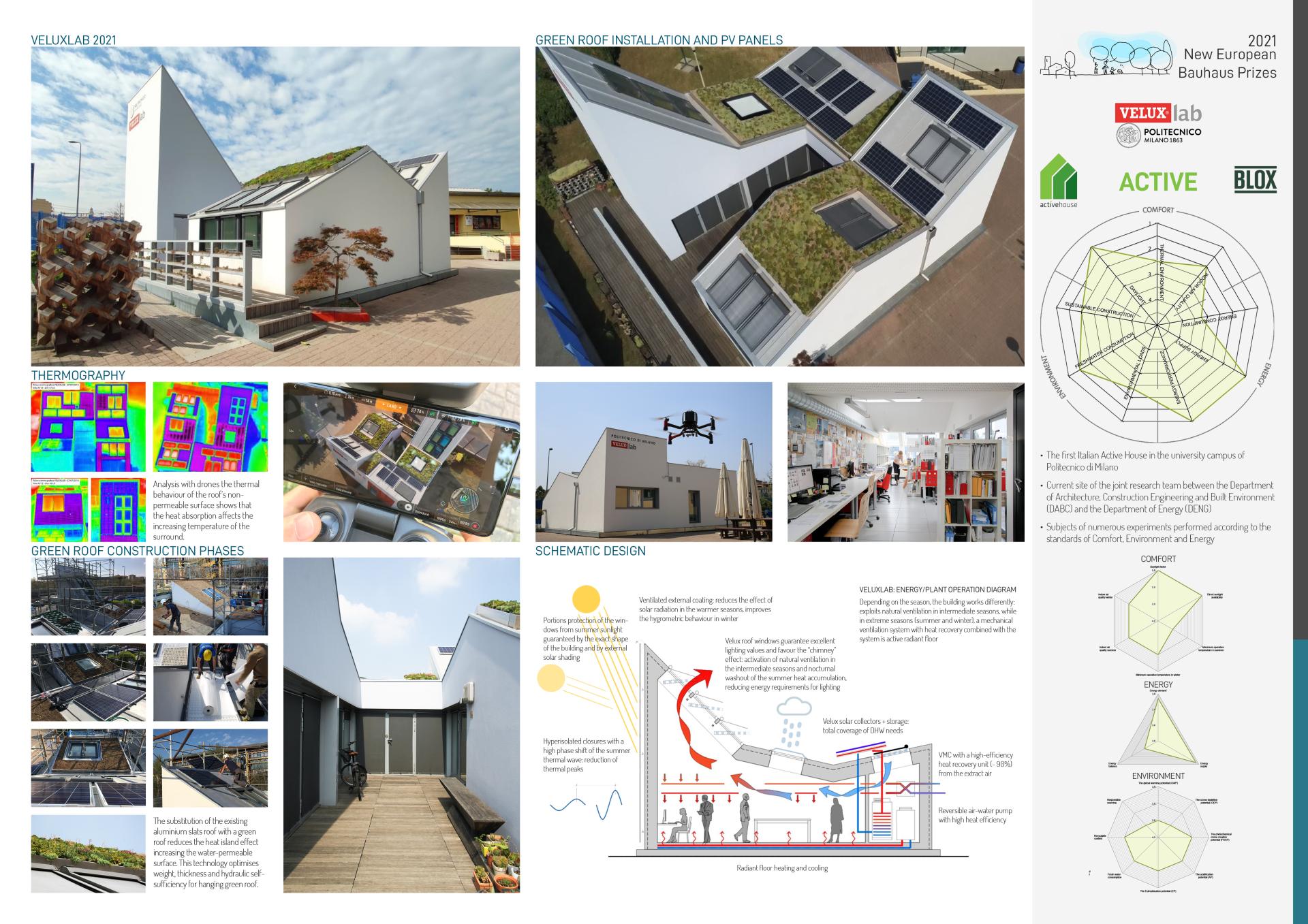 VeluxLab is the first Nearly Zero Energy Building (NZEB) of the Politecnico di Milano and the first Italian Active House. It is an open experimental unit designed through an innovative methodology and circular approach to managing the construction process, starting from the design phase to production, operation, and maintenance of a truly intelligent and active building. VeluxLab integrates aesthetic, design and technology, focusing on comfort, energy, and environmental building criteria.