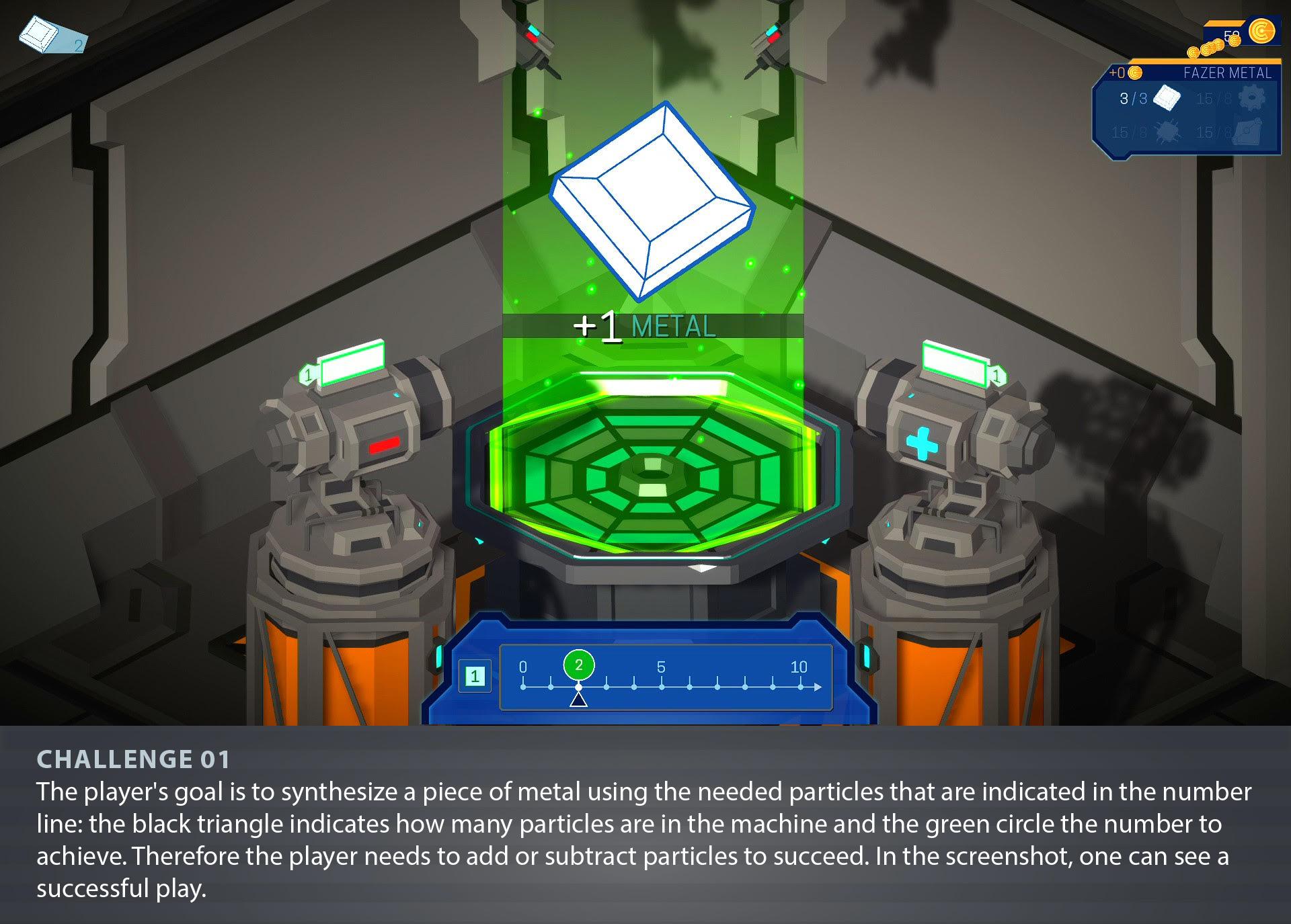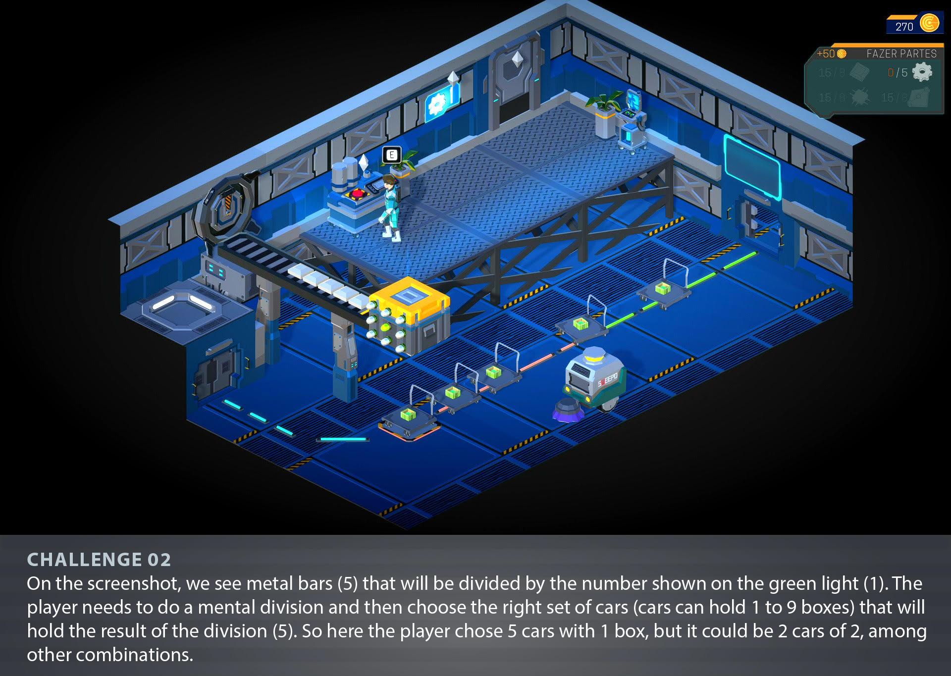 The key objective of SUDDEN was to create an accessible educational tool for DHH children. There is a general agreement in academia that DHH children perform lower in mathematics than their hearing peers and such is related to DHH lack of fluency in the language of culture, meaning the Portuguese in this case. There are no classes in sign language in our partner schools and Special Education Schools in general, but an LGP interpreter that “translates'' the teacher's explanations. SUDDEN is an active learning tool that could be used inside and outside the classroom. To this end, an in-game tutorial approach was developed, combining information on the challenge goals with step-by-step instructions. The game instructions are bilingual, integrating written Portuguese and Portuguese Sign Language (LGP); in the step-by-step panels that guide the player only text is used to minimize disruption in gameplay. In the introductory panels, game challenges, goals and instructions are communicated by a “virtual assistant” (VITAS). VITAS panels with LGP appear whenever the player-controlled character, the commander, enters the different spaces to create the resources in order to rebuild the space base. The panels have short and simple textual messages and images, to make them accessible for deaf children. The fluidity of the gameplay benefits from that approach, as it allows less interruption time and keeps the player's focus on the action in progress.